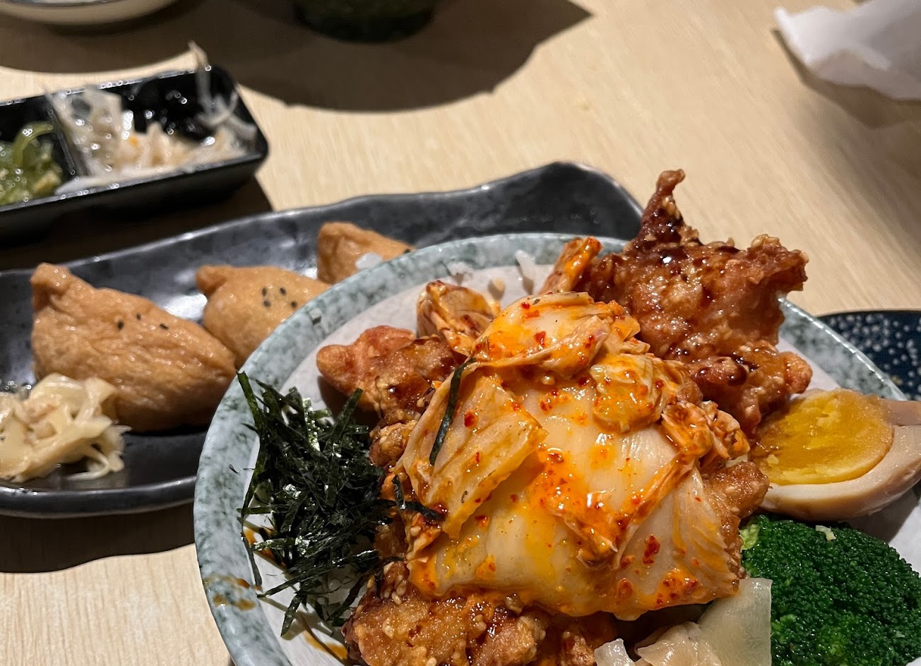 #食感:炸鮭魚壽司⋯外層酥脆⋯米粒香Q,裡面少許沙拉,哇沙米,調味,鮭魚呈現是生的(店家會詢問⋯可生食?或是製作成熟食),入口即化,好吃!花枝煎餅⋯外層超酥脆,裡面漿Q彈,花枝鮮Q,盛合海鮮丼長輩表示⋯海鮮新鮮,份量算多的!蠻不錯的!泡菜炸雞丼⋯泡菜香辣爽脆,炸雞外酥內鮮嫩,米飯粒粒分明,香Q好吃!烤魚下巴⋯富有油脂,魚肉鮮甜!炸蝦天婦羅丼⋯外皮酥脆,麵衣不會過於厚重,炸蝦鮮Q,蔬菜鮮甜,不會有油膩感!鹽烤雞腿蔥串⋯雞肉鮮甜多汁,蔥段帶有辛香感,不錯吃!胡麻松阪豬⋯豬肉香Q彈牙,搭配濃郁胡麻香甜,好吃!