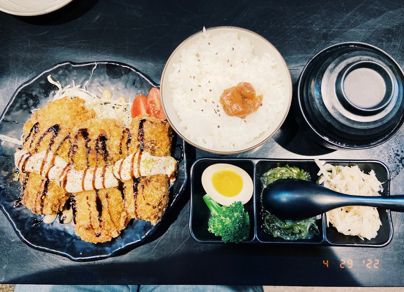 需要訂位,生意非常好,平價CP值很高的日料 當天訂12點,11:45到現場已經滿滿12點的客人在等候位了,沒訂位者要等到13:30 —-餐點—- ⭐送小菜炸魚皮,魚皮酥酥脆脆好好吃 ⭐鮭魚刺身(小)130元 鮭魚肥嫩好吃,滿厚的,五片吃的滿足 ⭐鮭魚丼190元 算大碗,鮭魚跟刺身盤一樣厚肥嫩好好吃,丼飯還附上小菜海帶絲&牛蒡絲與味噌湯,味噌湯很厲害裡面滿滿的魚肉豆腐海帶 ⭐燒肉沙拉130元 吃點蔬菜解膩,燒肉好好吃!!!醬也很讚 ⭐烤鯖150元 鯖魚非常肥,很有厚度,不腥 ⭐鮭魚天婦羅150元 菜單上沒有,是寫在黑板的特別菜,出乎意料的大份,有兩大塊鮭魚+很多蔬菜,炸的滿好吃不會太油 ⭐玉子燒 90元 很嫩有柴魚高湯香氣,些微甜甜的,份量不小 ⭐鮭魚炸壽司 85元 一開始以為這價格只有一塊,沒想到有四塊!!!真的吃不下了。這道是看到別人評論寫好吃