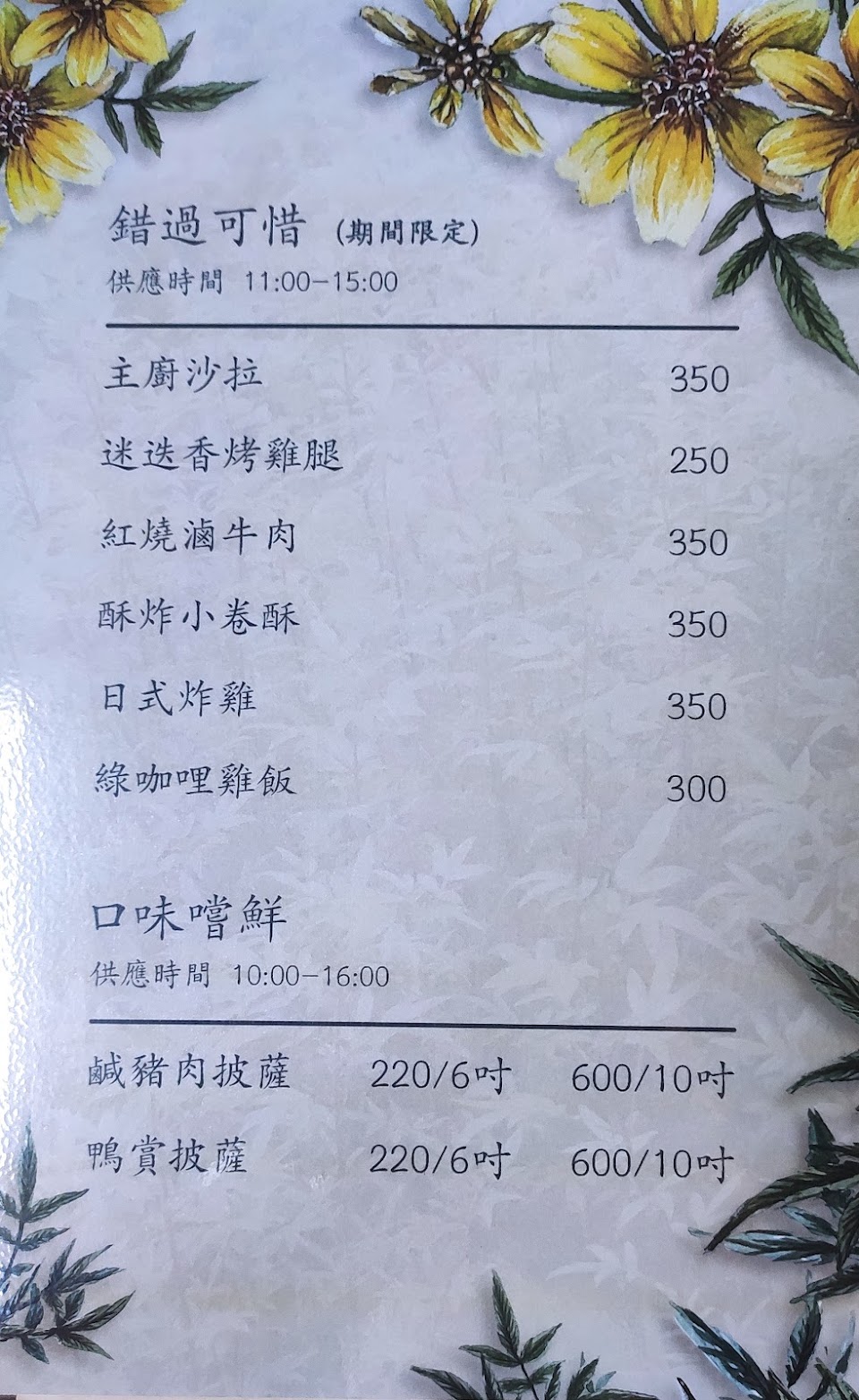 第一次來~平日、坐戶外人不會太多很舒服 套餐500元左右 有主餐跟茶 店員很親切!介紹完怕介紹太快~居然寫了兩張紙告訴我們裡面的成份! 這個舉動讓我們微笑了?