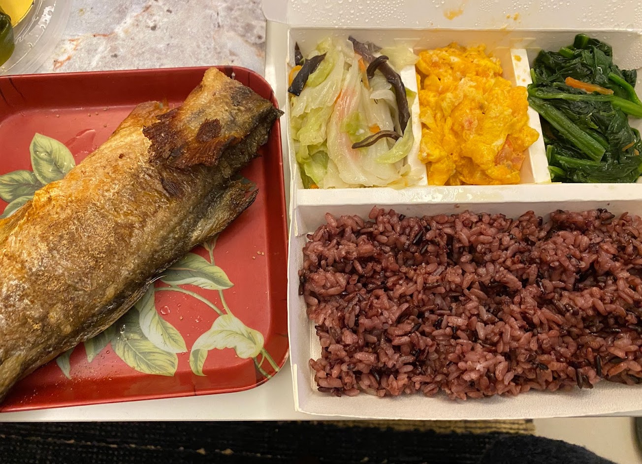 餐點一送上來太香就被我狂嗑~ 沒有拍到照片,只能用形容的: 今天點了鮭魚,魚肉非常鮮嫩、魚皮酥脆,三個配菜,1個綠色蔬菜、1個玉米蛋(還加了蟳味棒)、1個高麗菜,飯是五穀飯,湯是山藥雞肉(含滿滿的枸杞)。