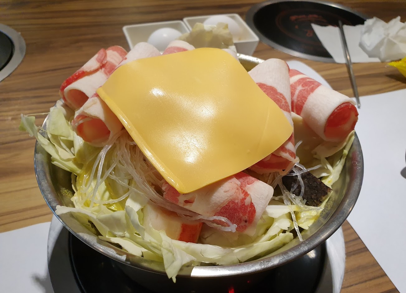 我點的是香濃牛奶鍋(NT$169)🥛🐮 上鍋光是看到那片起司🧀️ 心情整個大開花啊🌼 肉質好 肉量足夠 高麗菜多到像不用錢 附餐包含 蛋+冬粉+白飯
