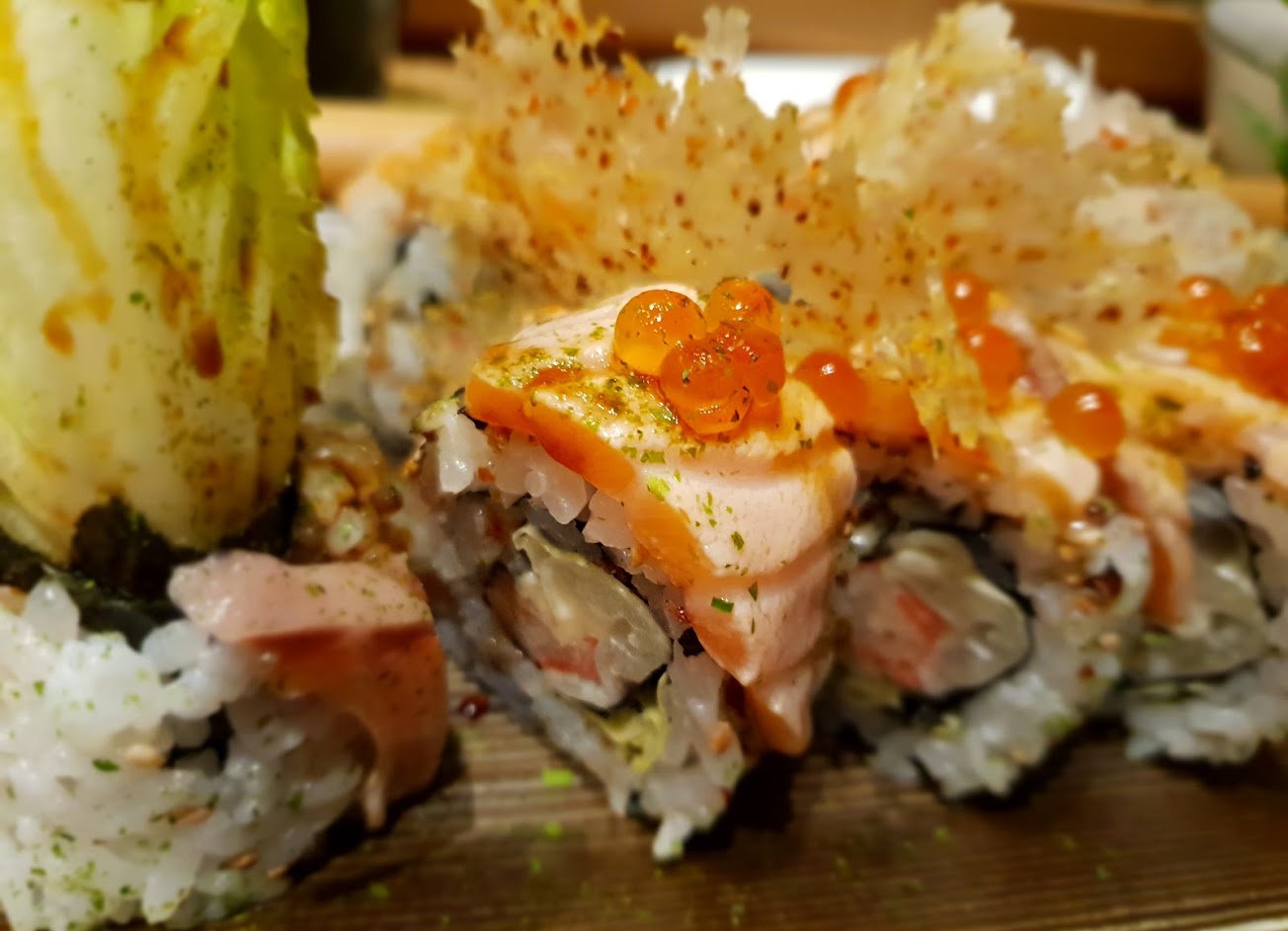 而這次我們的主食是壽司捲和虎咬豬。炙燒鮭魚壽司卷好吃,起司是一片片薄薄的,不膩口,一開始還沒讓人發現那是起司!