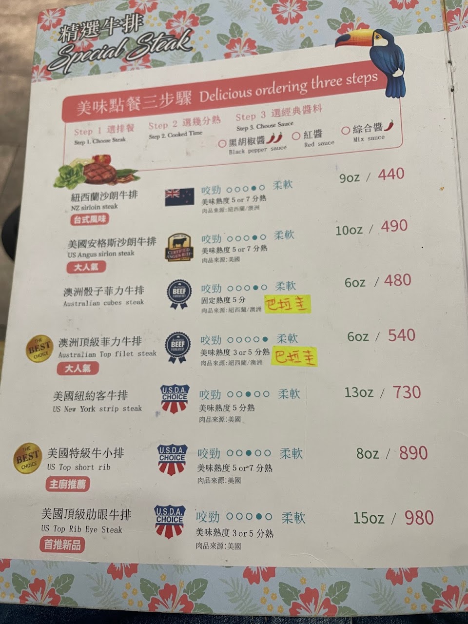 以上的餐點,價格都在380+1%以上,根本沒有這個價值,連夜市牛排都沒辦法比
