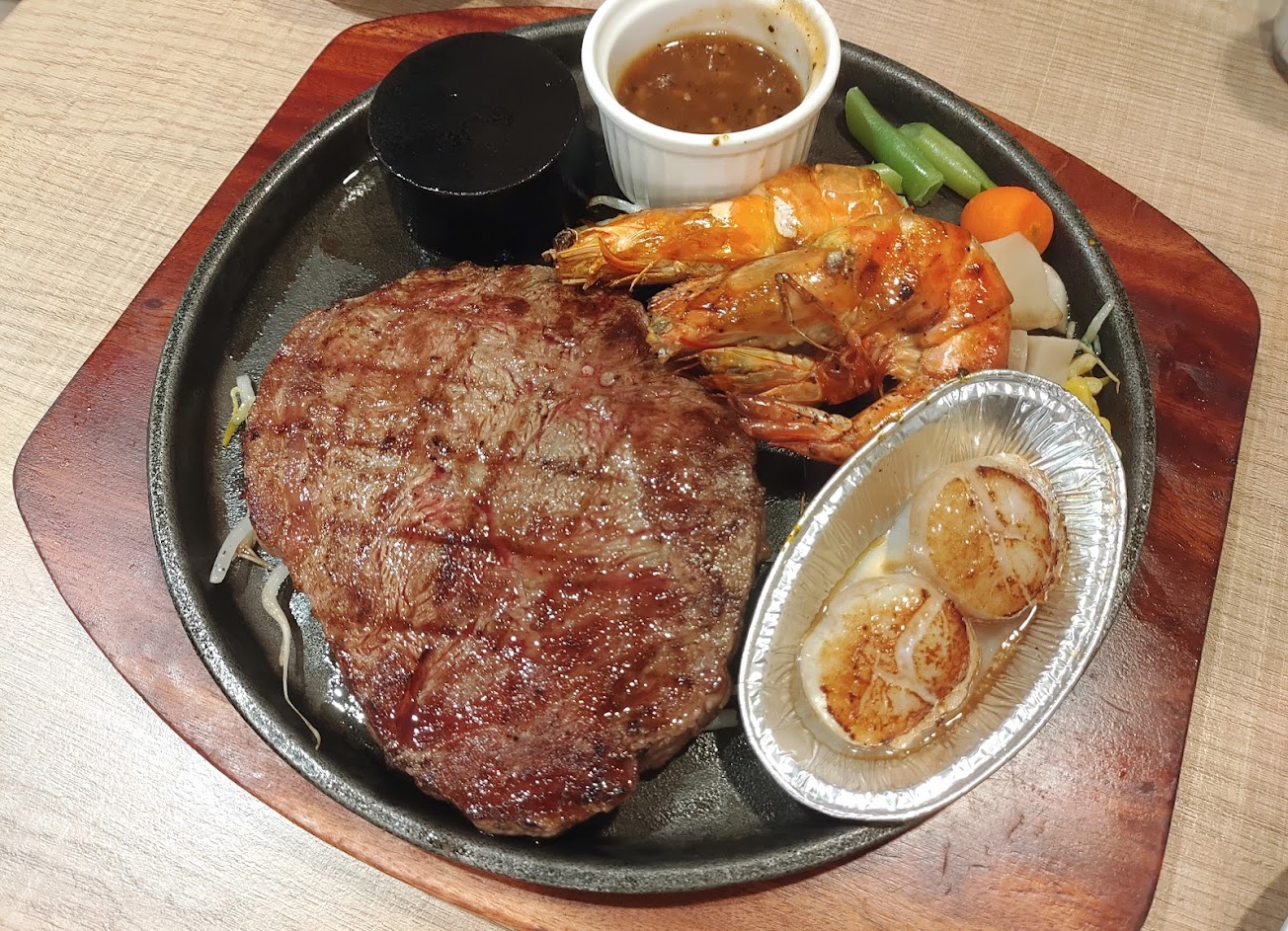 主餐-魷魚很可以、蝦子有點粉、豬排比紐西蘭牛排很嫩,旁邊有另外一塊加熱板,可以自已調熟度,很不錯