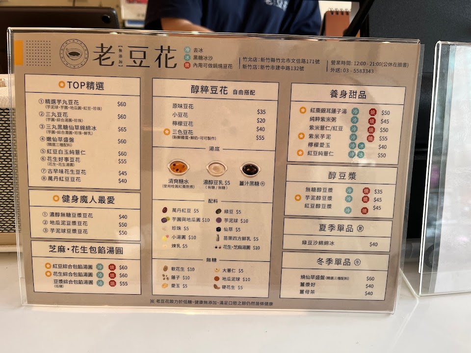 第一印象就是店面整潔、店員親切,第一次去店面購買可以請店員介紹,會依客人口味簡單推薦和介紹品項,店內環境乾淨且衛生措施做的很好,配料都有蓋子蓋住,一撈完都會馬上蓋回去,料理台也都會保持整潔? 店外有機/汽車的路邊停車格,很方便購買! 結帳時店員會提醒當期促銷活動和集點卡優惠,消費50元可以集1點,集滿15點就可以再換到一碗免費的甜品!(如果能改成Line電子集點卡可能會更方便一些) 餐點有豆花跟嫩仙草可以選擇,目前二次購買都是吃豆花加自選3種配料,配料都煮得很好吃(軟花生有軟、豆類也有煮開),湯底是健康路線不會過甜,整碗吃完也不會感到甜膩,冰的可以選去冰或是添加冰沙保持鮮度,很貼心。