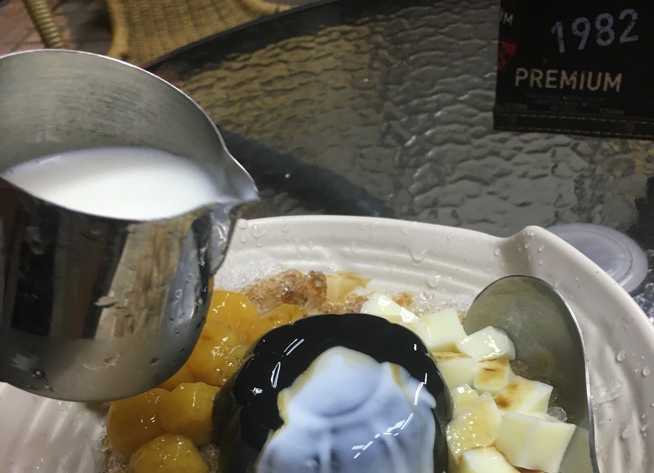 ?三奶雙芋冰 ??三奶包含牛奶、煉乳、牛奶QQ ??雙芋分別為蜜芋頭、芋圓 (個人不吃煉乳所以沒有加) 一端上桌其實有一些被嚇到? 第一次吃到會灑花生粉的冰 他們的蜜芋頭果然沒有讓我失望✨ 有一點軟嫩又有點綿密扎實的口感 蜜到有入味 再加上芋頭的香氣 芋圓有稍稍硬了一些 整碗雖然我是衝著芋頭來著的 但一旁的牛奶QQ卻也深得我心? 吃起來Q軟像果凍有彈性?