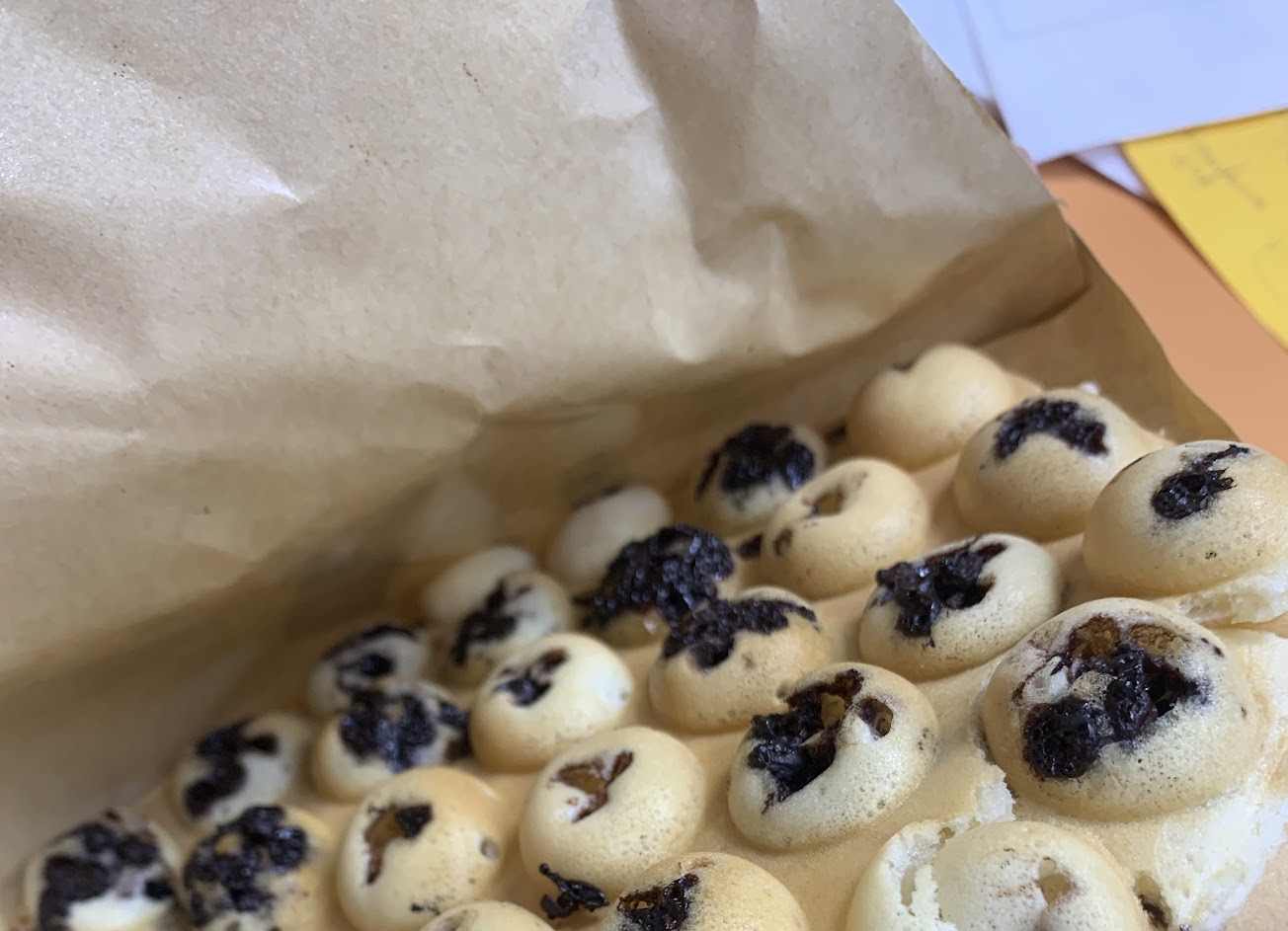 香濃巧克力雞蛋仔:是有巧克力豆搭載原味麵糊,巧克力豆分布不均,但是比起起司的更加有口感,起司略顯單調只有外皮灑上,無內餡,整體來說跟正統雞蛋仔比起略為遜色,因為剛拿到手的雞蛋仔本身居然就不是酥脆的外皮,大大打擊,很像是在吃雞蛋糕
