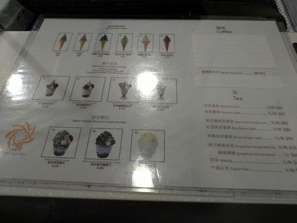 個人習慣甜品冰品搭配不甜飲料,這兒不甜飲料:美式咖啡、咖啡拿鐵、抹茶咖啡、抹茶拿鐵、焙茶拿鐵、抹茶。尤其無糖熱抹茶,原以為會苦,喝來卻不覺得苦,很適合搭配霜淇淋。