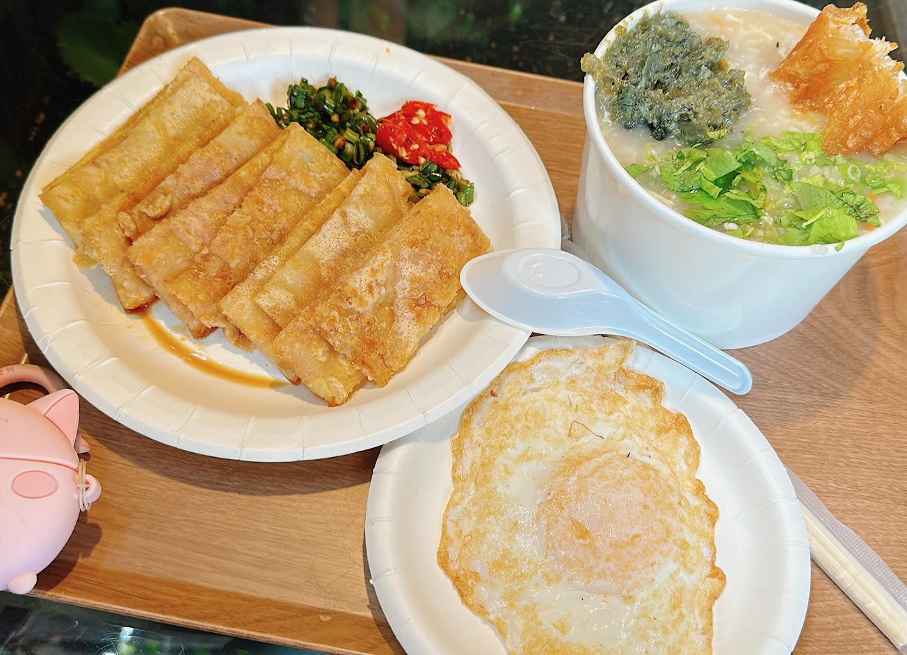每次必點鮪魚剝皮辣椒蛋餅 脆皮又帶河粉 也推薦鹹粥 平日特色 外帶到公司和學校享用是小確幸