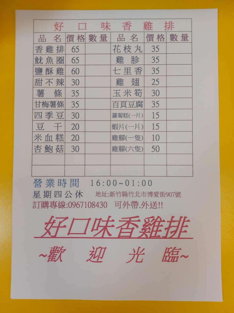 2024最新在地推薦餐廳的菜單_竹北好口味香雞排的菜單、圖片