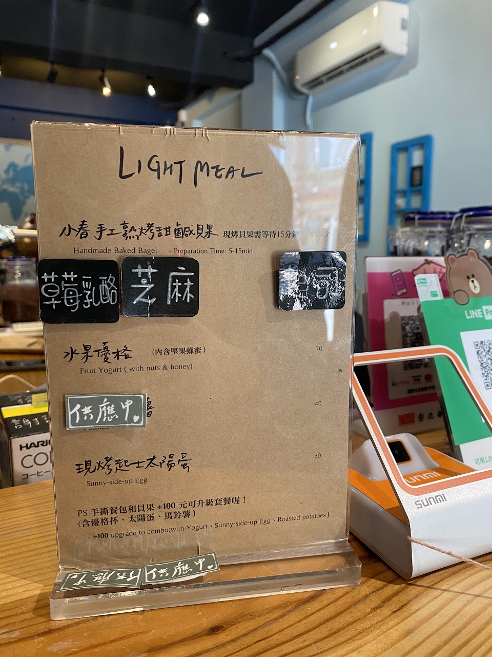 至於食物的部分,種類不多,但也是有甜有鹹的可以選。雖然我們滿愛吃貝果的,不過因為現烤的貝果需要從冷凍退冰,店員提醒說要等15分鐘,所以我們最後是點餐包。選了起司口味和奶酥口味各一份,比較推薦奶酥口味?