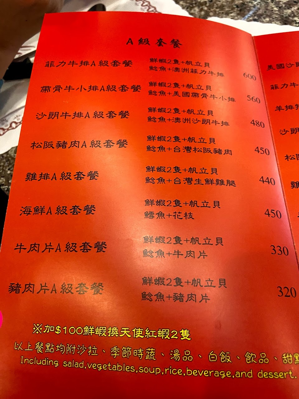 吃一份沙朗A餐 $500,以整體cp覺得偏貴,不如加一百多吃陶板屋