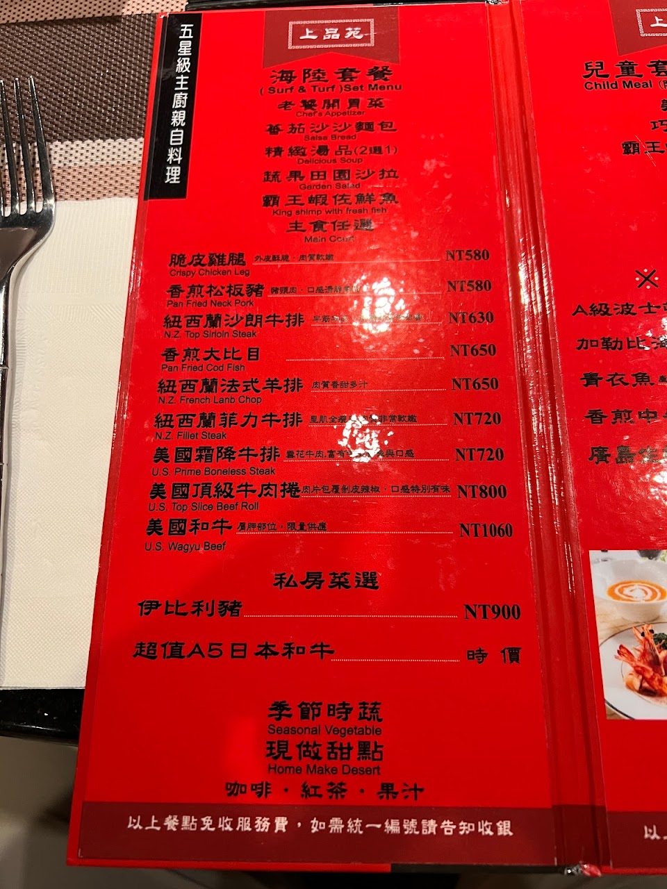 服務非常好?廚師也很貼心看到小孩麵包不會煎太焦 服務員也會提醒你餐點適量❤️我已經吃過好幾次了很棒很棒!唯一小缺點就是牛排?可能冰太久了!味道跟口感不太喜歡 但看起來松阪豬很好吃
