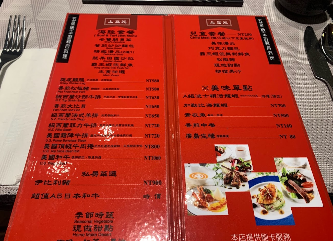 主食任選 脆皮雞腿 外皮酥脆 肉質軟嫩NT580 香煎松板不 豬頸肉 口感清脆香甜NT580 紐西蘭等沙朗牛排 半筋半肉 有嚼勁富有肉香NT630 香煎大比目NT650 紐西蘭法式羊排 肉質香甜多汁 NT650 紐西蘭菲力牛排 里肌全瘦肉 肉質非常軟嫩NT720 美國霜降牛排 雪花牛肉 富有牛肉香味與口感NT720 美國頂級牛肉捲 肉片包覆剝皮辣椒。口感特別有味 NT800 美國和牛 肩胛部位 限量供應NT1,060 私房菜選 伊比利豬NT900 超值A5日本和牛 時價 季節時蔬、現做甜點 咖啡•紅茶 •果汁 以上餐點免收服務費 服務 內用 餐點類型 晚餐 平均每人消費金額 $400-600