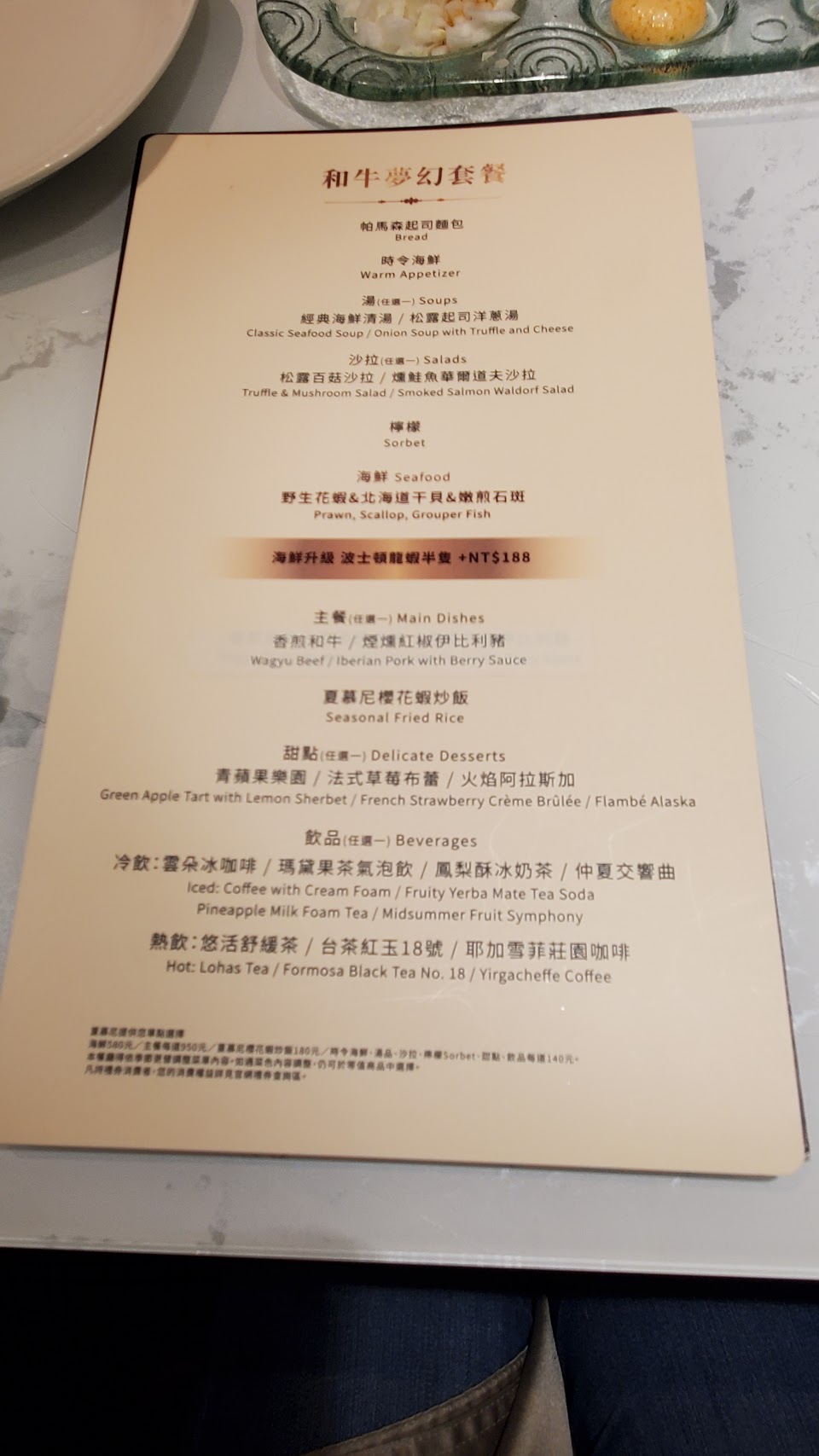 服務態度優良? 這次點的餐點是 「和牛夢幻套餐,並加價升級波士頓龍蝦半隻」 主餐還不錯 但其餘餐點這樣搭配起來 些許空虛⋯⋯