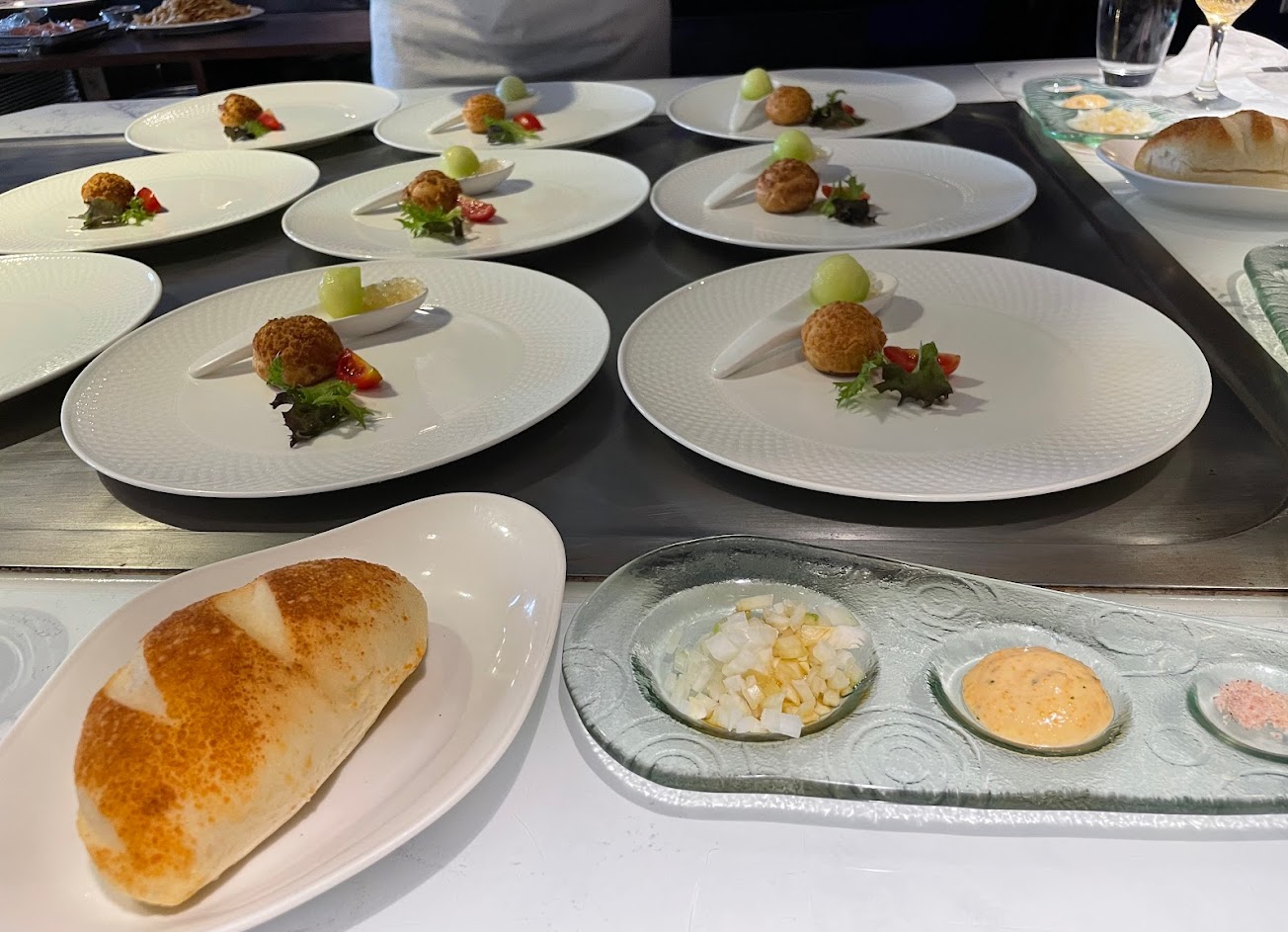 烏魚子茶碗蒸及松露泡芙,還有哈密瓜?佐火腿,個人覺得松露泡芙比較特別驚艷到,內餡有濃郁的松露特有氣味,可惜如果泡芙外皮更加酥脆微熱的話會更好。另外哈密瓜火腿吃起來相當清甜,更加襯托出火腿的鹹香。