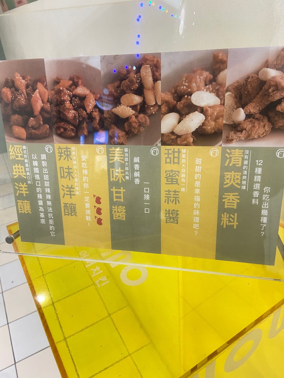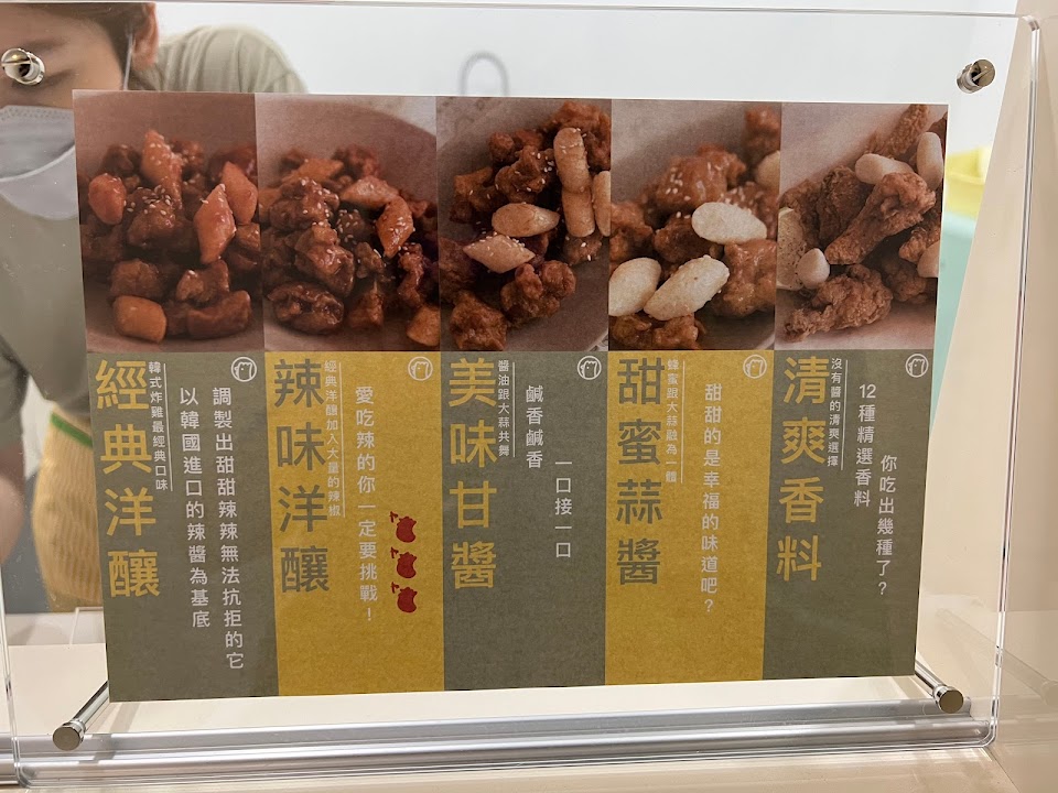 辣味洋釀系列雖然超級好吃但真的很辣(個人很喜歡,無辣不歡的人吃起來真的很爽)老闆服務很好,而且很有耐心,餐點是好吃的,推薦點翅腿的!(比大型連鎖韓式炸雞好吃許多!)