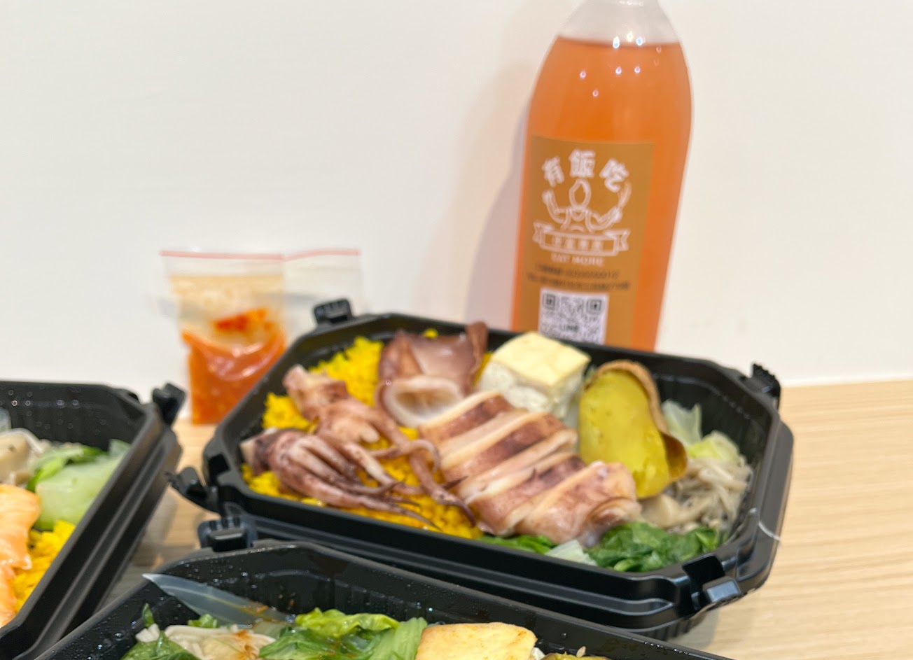 「深海魷魚」 整隻魷魚的便當? 魷魚直接吃沒什麼味道 有附一包酸辣醬 泰式風味 醬是靈魂 大膽加! 多的醬淋薑黃飯上更有味道