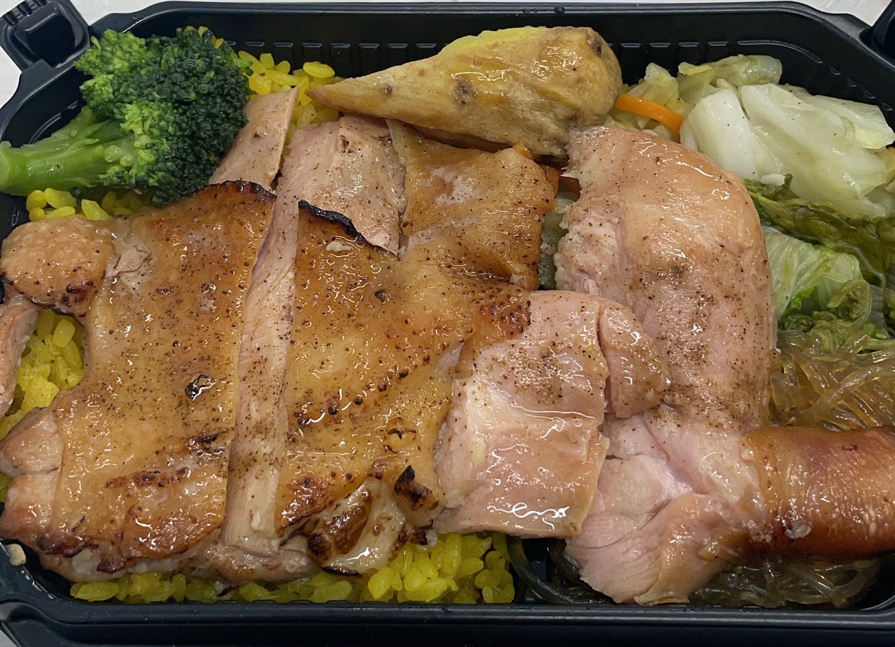 雞胸吃起來很像在吃雞排(嫩的那種),不太像舒肥雞肉(我印象中連鎖健康餐的舒肥雞胸肉好像會有種軟軟QQ的口感?) 份量還可以~不要飯的話可以換成青菜(很適合我哈哈)。一般的話,飯可以選薑黃飯或是紫米飯,另一半選了薑黃飯,他覺得還不錯??