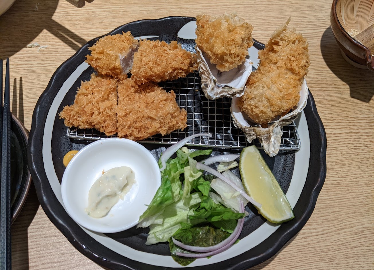 高麗菜絲爽脆,豬排肉嫩好吃,牡蠣大顆 唯一美中不足的是炸豬排店,但菜單上的招牌黑豬肉以及較厚的豬排在晚餐六點的時段就賣完了,實在是很可惜備貨量不夠充足