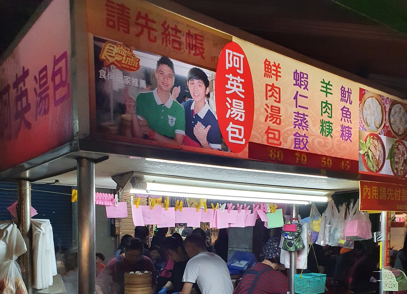 今天想吃有名的阿英湯包,滿滿的排隊人潮聚集於攤位前,生意好到前頭在賣老闆、老闆娘在點餐安排座位顧蒸籠、舀湯,後頭三位師父以俐落快速不間斷的身手包著湯餃,想吃的朋友到場時請先畫單付錢,老闆娘會給你號碼牌,然後就是耐心等候✿