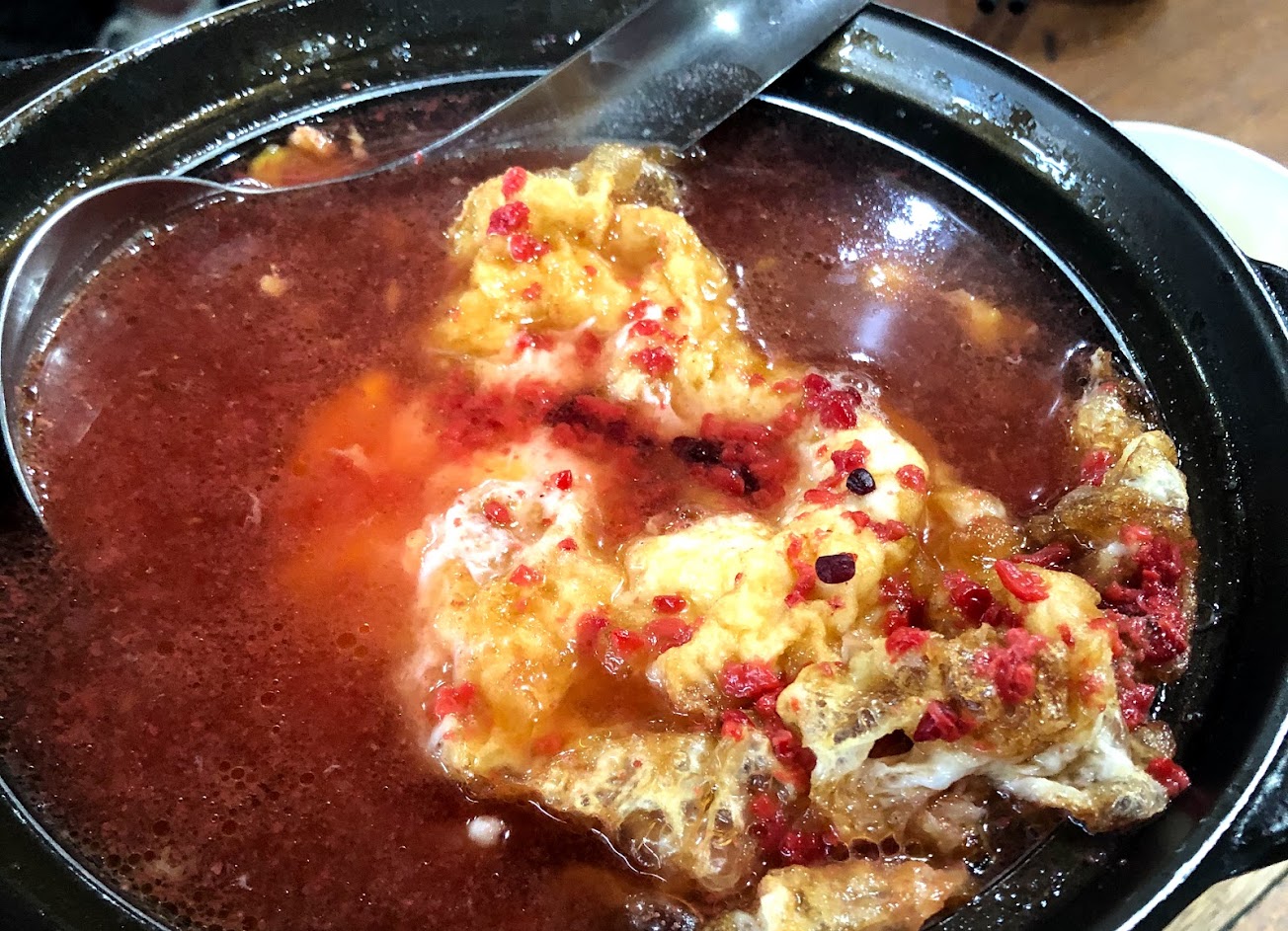 3.紅酒糟煎蛋蠻特別的一道菜,可以吃得出濃濃的酒糟味,但跟我想像中的不太一樣,!我原本以為是乾的有收汁過的,且味道有甜,個人比較不愛。