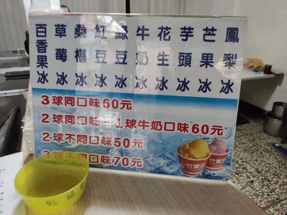 竹東玔綿綿冰賣的是天然水果手工製作而成。主要原料只有三種。天然水果,天然蔗糖減量,以及少許白開水製作完成。沒有添加任何人工加工原料。有多種水果口味可以選擇。吃完之後,沒有負擔。好吃清爽又不會太甜。我推薦愛吃冰又注重身體健康的朋友可以到這家店內品嚐天然水果及果泥的芳香。