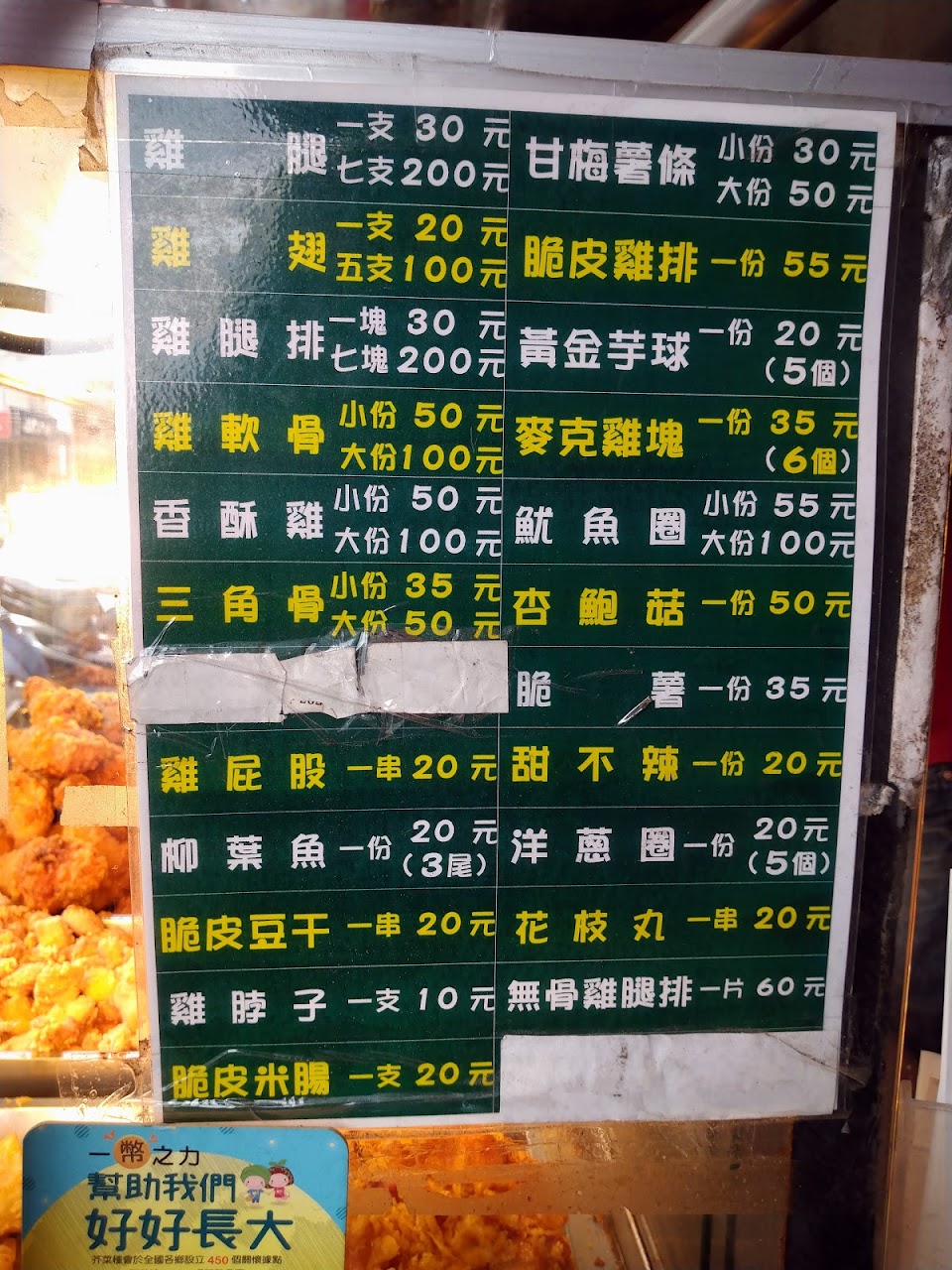 三份炸雞塊或雞腿要價新台幣 100 元,口味沒有胖老爹優,價格符合條件。