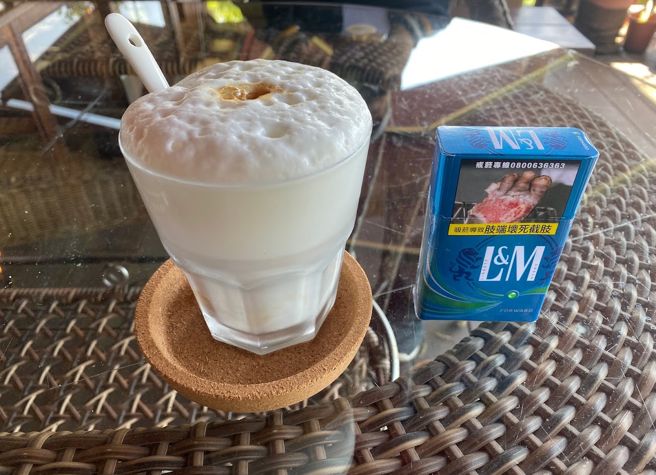 氮氣咖啡很大杯 拿鐵很小杯 起士安格斯牛肉塔好吃 ps….菸盒只是丈量 我都走出店家門口抽耶 哈哈