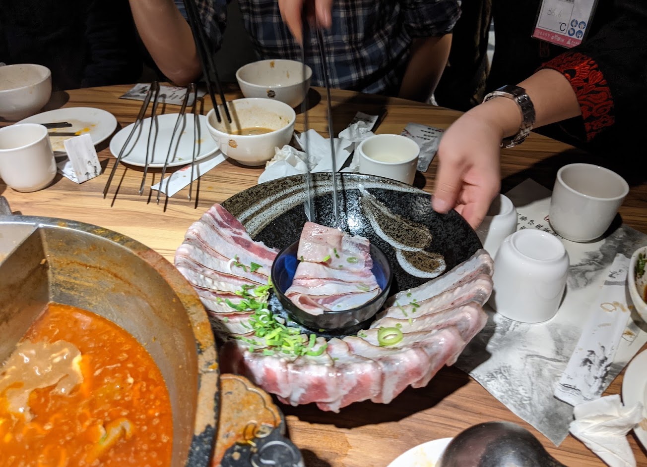 其中一道火焰炙燒豬,將豬肉片放到高粱酒中浸泡炙燒還蠻有意思的。(酒精中毒太深的會吃不出有酒的味道)