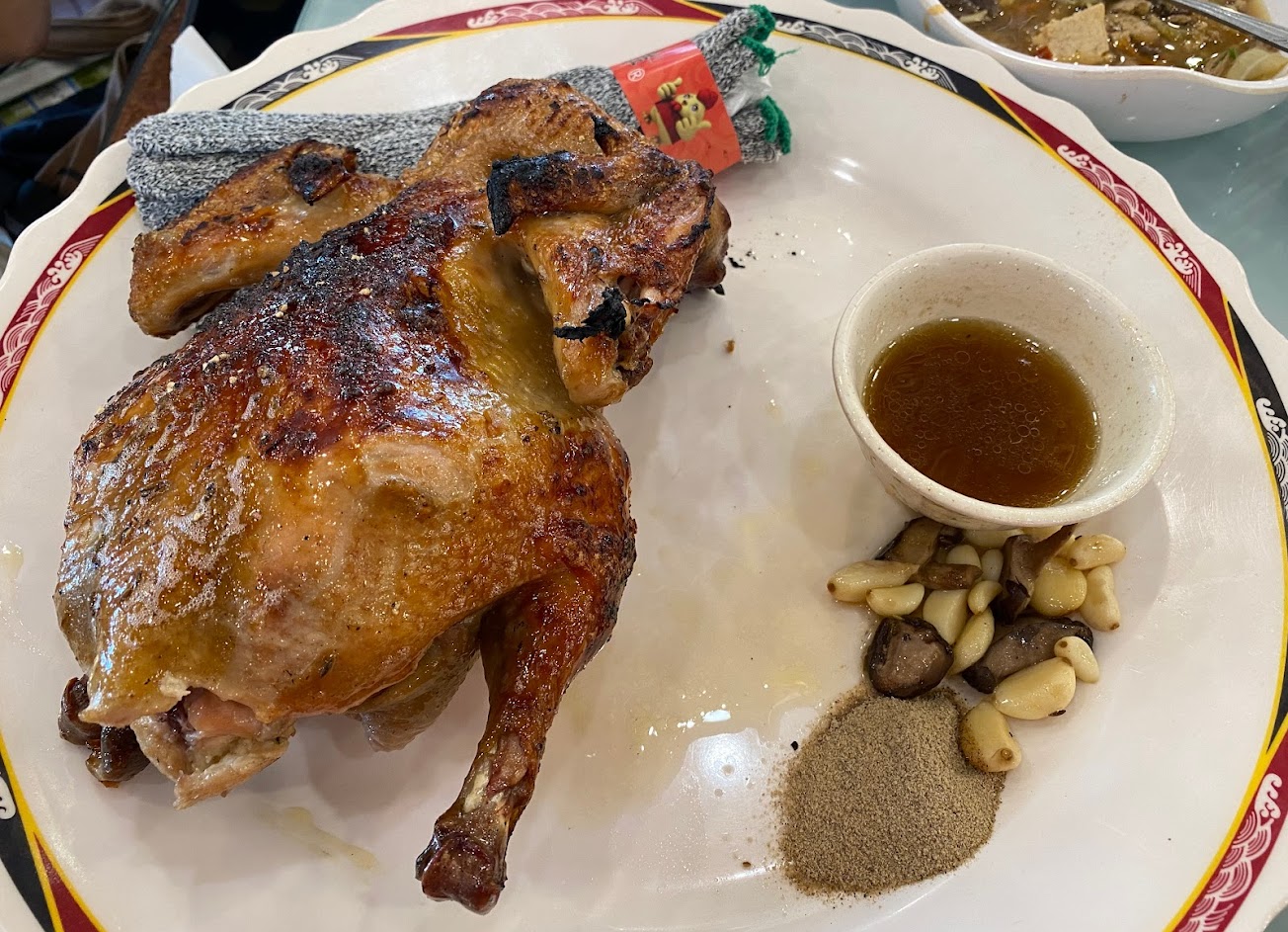 ?甕窯雞,外皮酥脆肉質鮮嫩,有淡淡的煙燻藥材味,搭配雞高湯和胡椒蒜頭,每一隻都是新鮮出爐上桌.