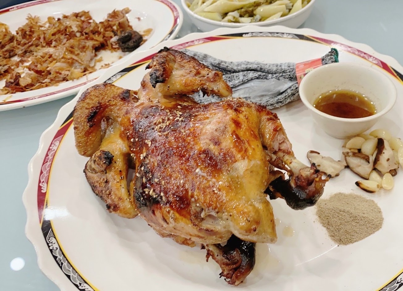 11:00到停車處,進入餐廳內有二桌客人,菜很快陸陸續續上來,白飯等了很久,催了幾次,又等了很久才端上桌,有點溫溫不熱,感覺是隔夜飯,沒關係期待的烤雞也上桌了,載好棉手套套上塑膠手套,抓住了烤雞開剝….也不燙,扒到中間肉更是溫溫的,吃過多次烤機,心裏想難道也是隔夜剩下的,一入口全家人都有這樣的感覺,雖然沒問題但還是有點期待跟落差,只好告慰一家人下次不要一開店就來,晚點再來吃吧!