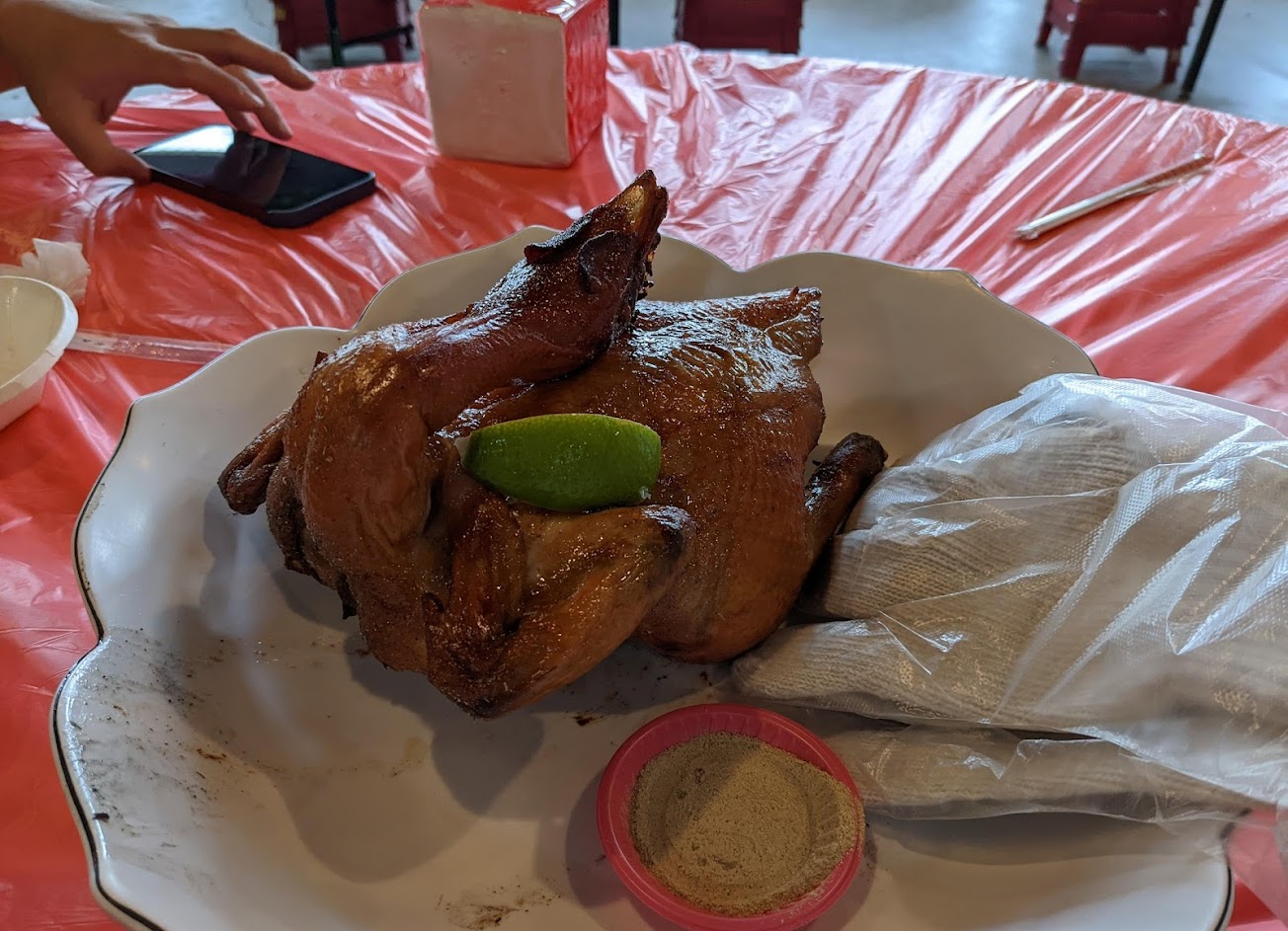 停車位多,裡面桌位也很多,自己去櫃檯拿點菜單後,自己去找空桌,上菜速度還行,烤雞好吃