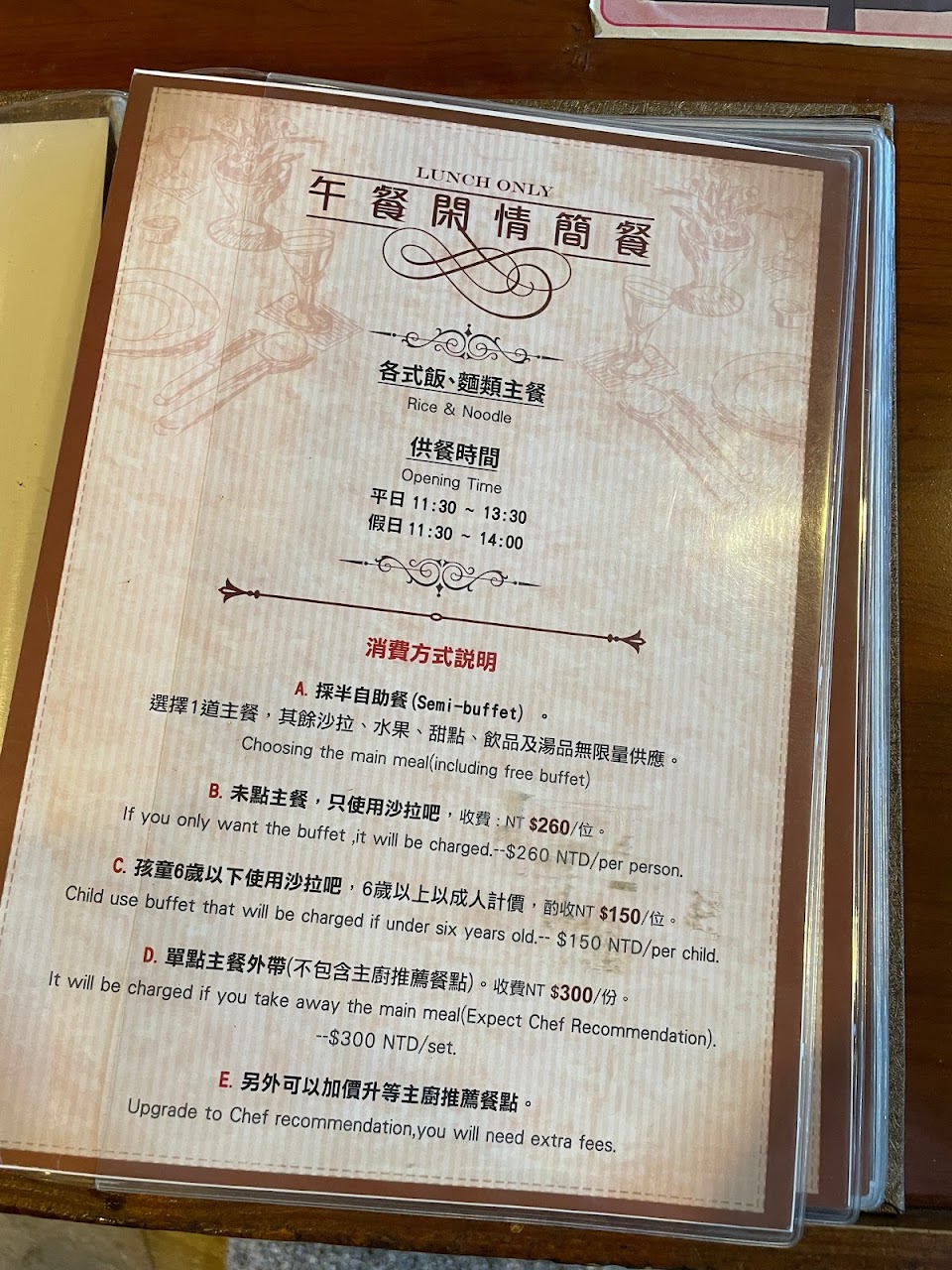 套餐有沙拉?、濃湯、奶油餐包吃完還可以續、主餐每一道都很精緻而且份量也很多,最後還附上一杯飲料,洛神花茶味道很濃不錯喝。桌上也有附餐前水蜜桃香檳雞尾酒大約五%左右酒精濃度不錯喝。 一餐一餐下來也吃的很飽很滿足. 工作人員非常的開心也很熱心服務態度也非常得好。