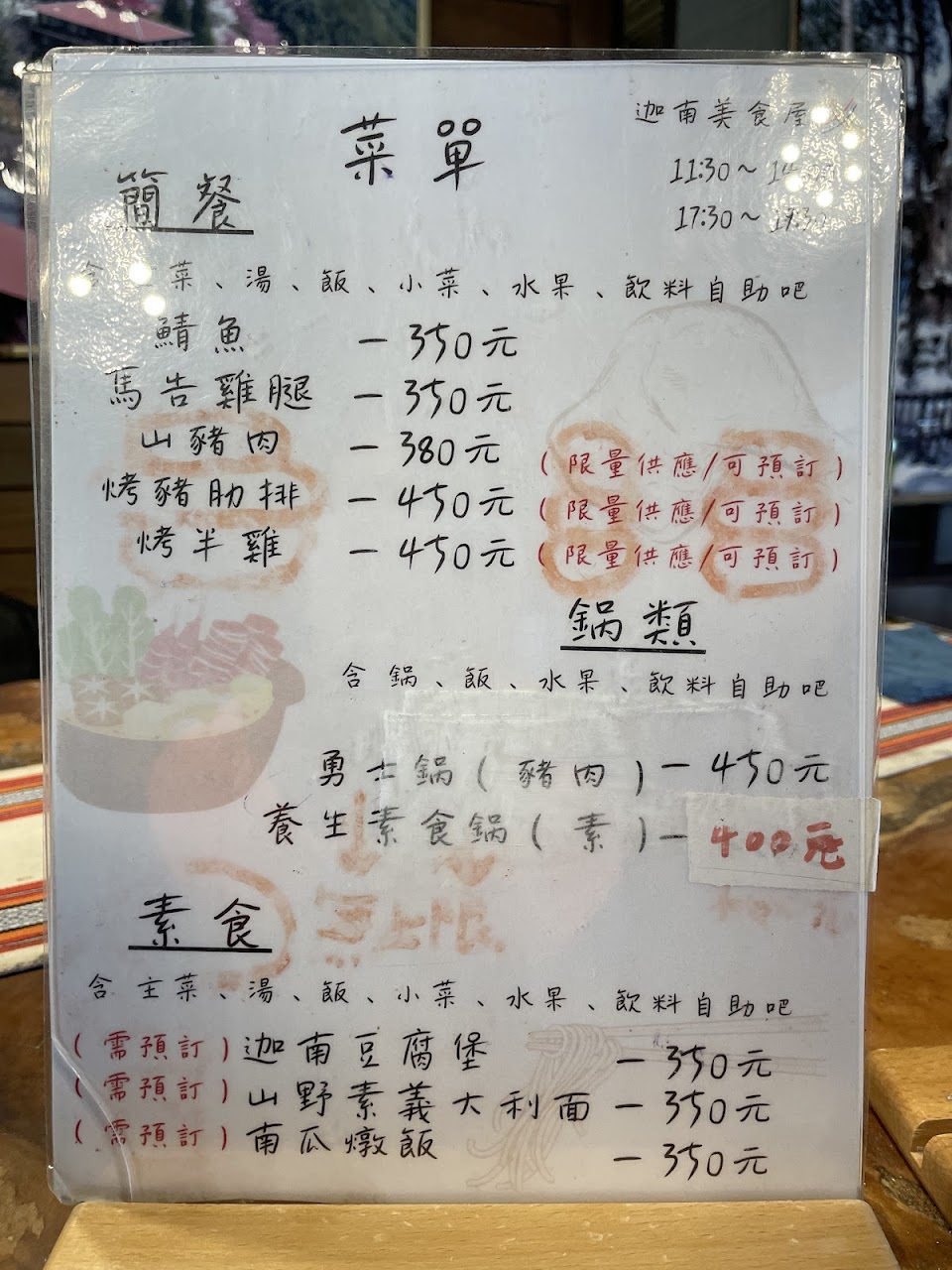 和友人一行四人點了三個餐,烤半雞飯450(雞肉有濃濃香草味,讚哦)、烤山豬肉380(烤肉鮮,Q彈)、和勇士鍋450(淡淡的中藥香氣,屬於清淡湯頭的豬肉火鍋)。店家有提供檸檬紅茶、和熱開水。4個人吃三份餐,份量很足夠。我來許個願-下次來用餐,若能增加新鮮蔬菜,那就太好了。