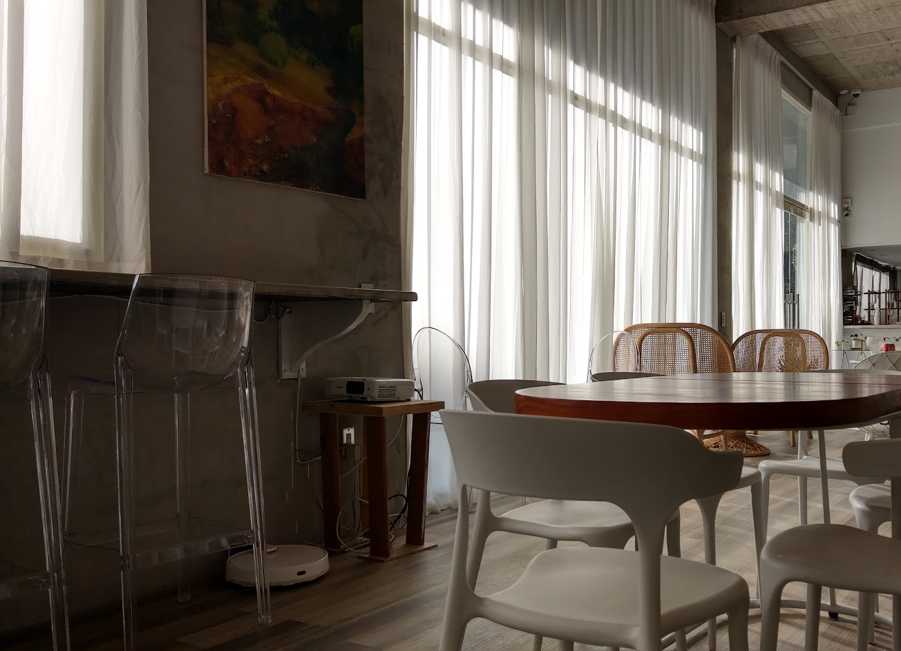 金融業退休的胡老闆夫妻,遠從北投搬來,與兩個女兒,孫子,一起經營。2020年七月起開始試營運,同年十月開張,當做他們朋友的據點,也是團聚三代人溫暖的家。傢俱,餐具,音響都相當用心,有趣。牆上掛著裝修的草稿,自己家人的畫,書架上則應該是他們自己讀過的書。整個裝潢,有著溫度,低調舒適的品味。面南,大大的落地窗,頓時讓我想到海明威形容一個舒適的地方的用辭,dry and warm。兩隻我不知道品種的鳥,十分愛”說話”, 啼聲悅耳,對其吹口哨,還會跟我”對話”。長長的酒單,開車,不敢嘗試;咖啡豆有選過,不錯;點了烤馬鈴薯與pizza, 都很可口。車位好停。廁所乾淨,有噴水馬桶座,連擦手紙也有講究。門口一隻黑白花貓,希望不要對兩隻可愛的小鳥不利。