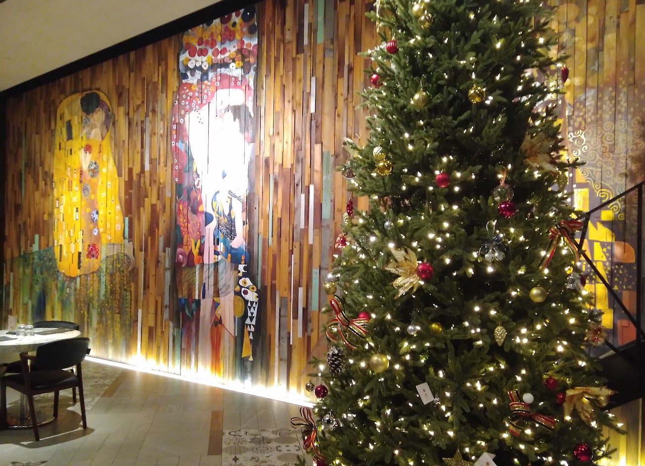 豪華海鮮拼盤完全不推,海鮮烤得乾柴,份量上也實在和豪華搭不上邊,價格倒是豪華級別。德國豬腳是聚餐所有人中第一個上桌的主餐,表現中規中矩來,這邊應該就是專心喝咖啡享受店內的氛圍,主餐則可當配角。大面積的手繪畫作應是向克林姆致敬的倣效作品,由左而右依序是吻(The Kiss),母與子(Mother and Child),艾蒂兒·布洛赫-鮑爾肖像一號(Portrait of Adele Bloch-Bauer)。