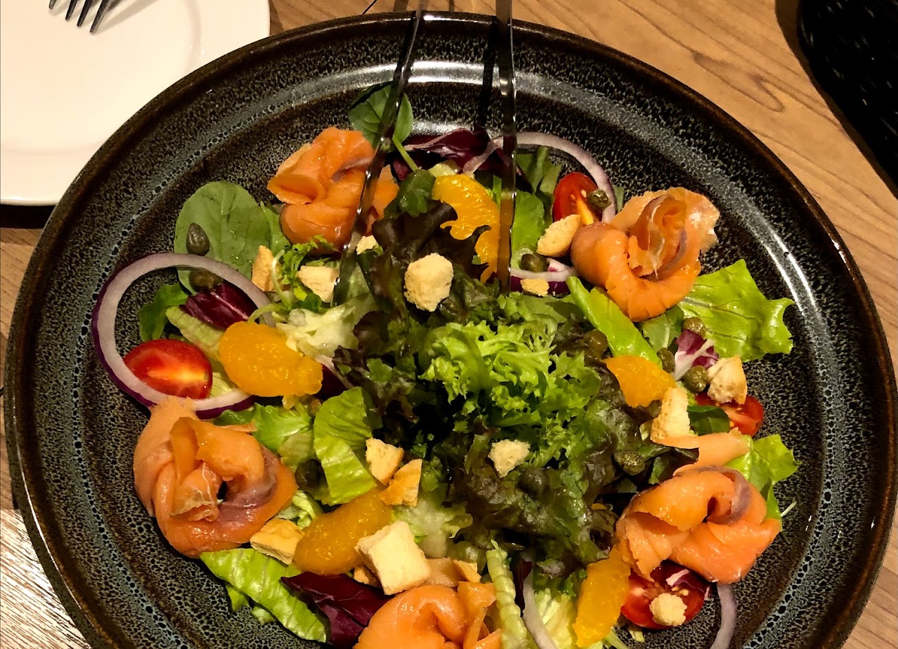 昨天晚餐點了三道菜色 一. 推薦項目: (一)除了鮭魚太乾(是因外帶嗎?)其他都很好吃? (二)鮭魚佐波菜醬時蔬非常豐盛,調味很好(可以單點時蔬嗎 哈哈) (三)漁人海鮮拼盤很豐富,冷掉也好吃,?有撥好殼 (四)爐烤海鮮沙拉:各種時蔬很繽紛,可惜鮭魚太乾硬,其他蝦子、大章魚滿分