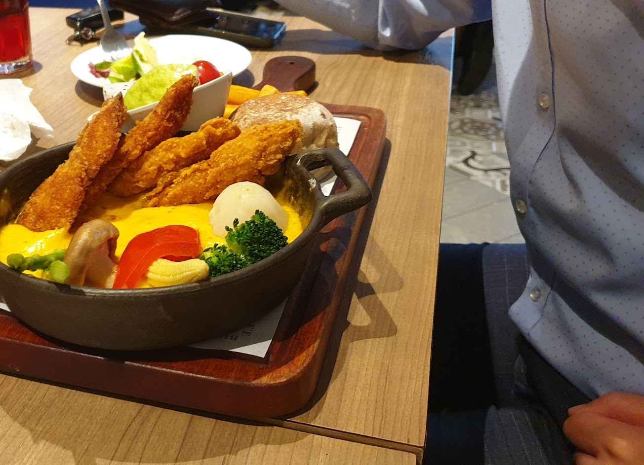 不限時餐廳❤聚餐聊天最棒的地方 紅咖哩海鮮,海蝦烤餅,起司鍋,鮭魚凱撒沙拉,青醬考烤腿義大利麵,主廚濃湯都好吃。 鮮果汁飲料味道淡一些,黑糖波斯頓很綿密很新鮮,服務人員很熱心,謝謝。