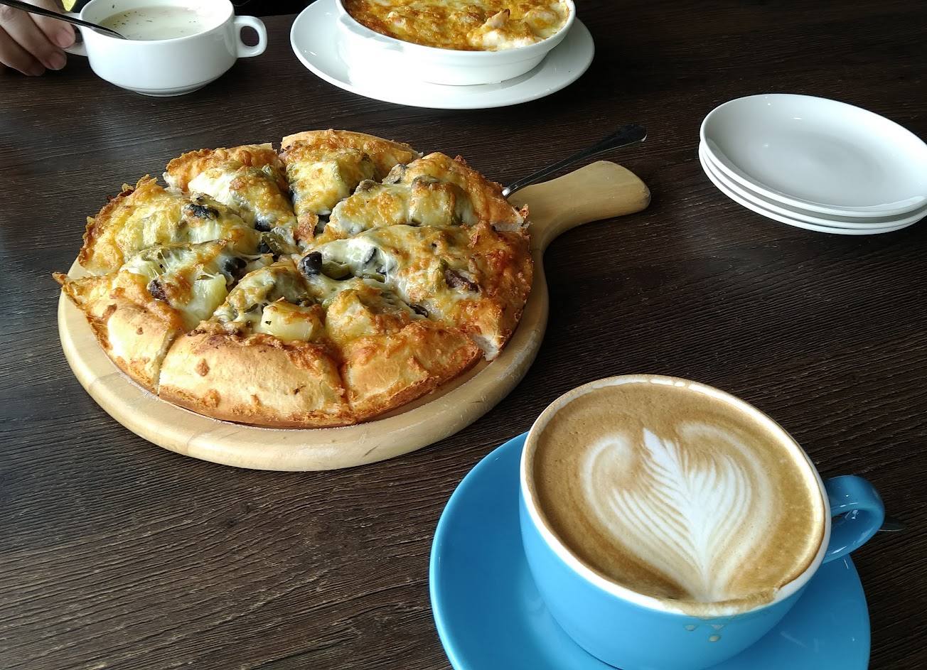 鹹豬肉批薩不錯吃,鬆餅也還可以,唯一不足的地方是路很小,標示不清楚,停車位嚴重不足!