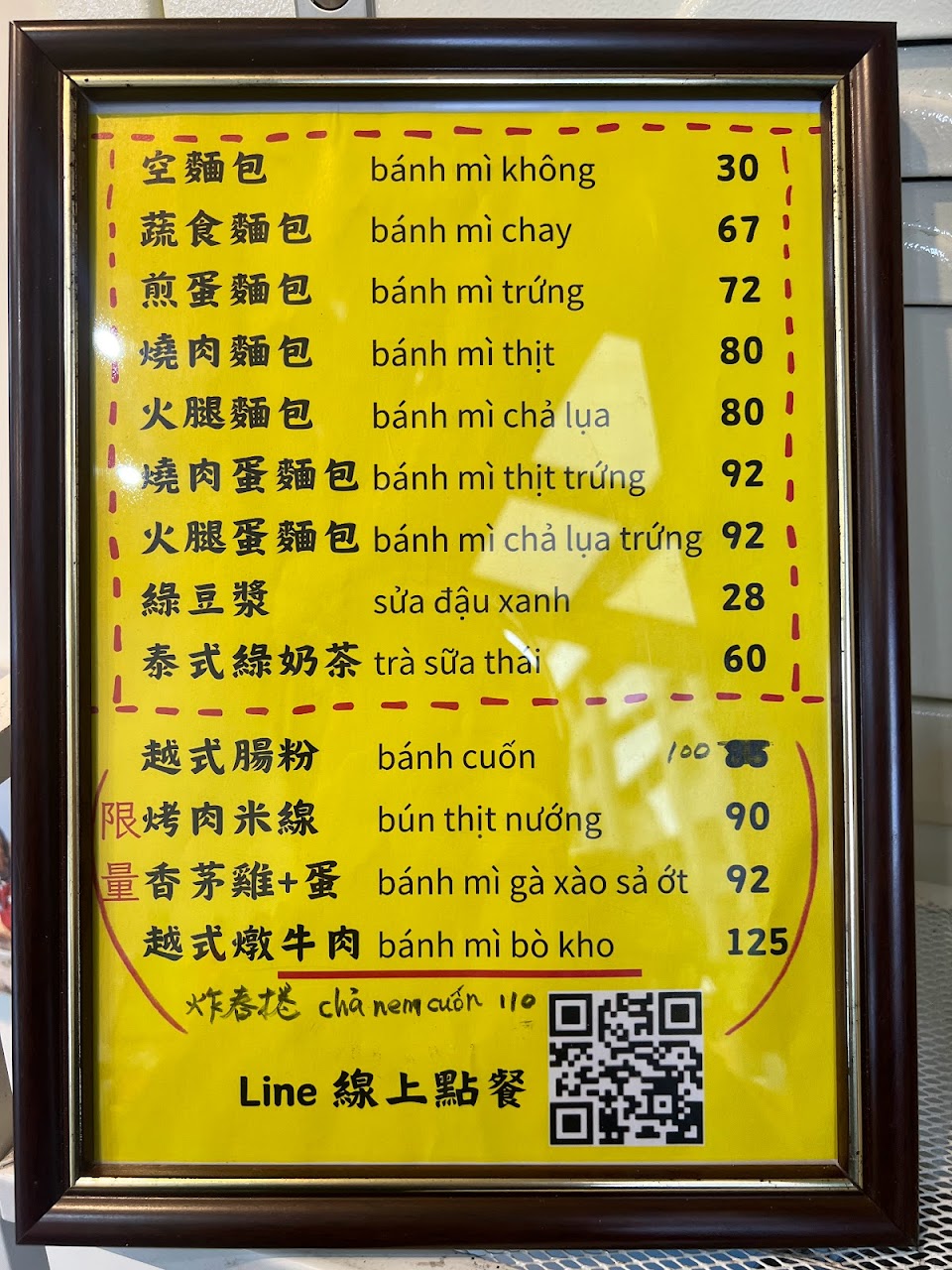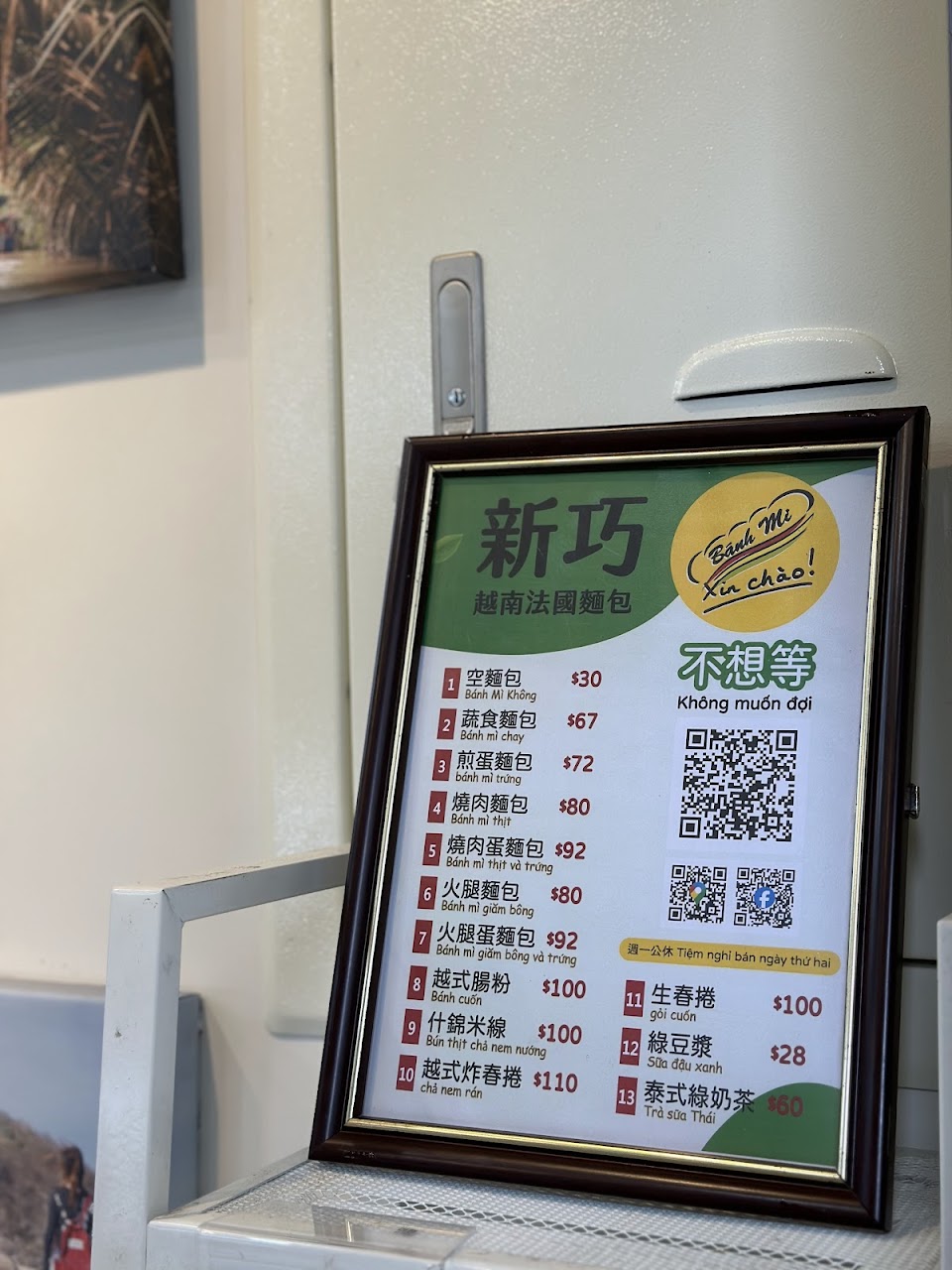 來體驗一下越南特色小吃,道路兩側有都劃白線,平日很好停車;上次來超多人排隊的,所以沒機會吃到。今天很幸運可以吃到,今天現場內用專屬我一個人的座位,因為內用只有一桌喔! 看到那麼大的麵包怕吃不完,老闆貼心幫我對切,另一半外帶回家去。老闆將麵包烤的酥脆,加上越南特色肝醬及厚切長長的小黃瓜、白蘿蔔跟洋蔥,滿滿的新鮮蔬菜,咬下去外酥內軟的麵包,再加上清脆的蔬菜、蛋、燒肉、火腿,真是大大滿足,燒肉外層紅色,看起來感覺像台式燒肉,但是吃起來像叉燒口感、火腿看起來像素火腿,整體搭配起來如此好吃,老闆建議小辣,不太吃辣的我可以接受這樣的搭配一樣好吃,再來杯綠豆漿有種綠豆沙牛奶的感覺,我個人挺喜歡的。 順便外帶空麵包回家,還有試試泰式綠奶茶,綠奶茶我覺得奶味比較重有點偏椰奶的感覺,裡面還有類似切丁果凍,我對太奶的飲品不是很愛,所以還是喜歡綠豆漿,其他春捲、麵線還沒機會吃到。感覺到老闆的用心及對品質的要求,對客人也很熱情,下次有機會再來試試其他商品吧!不想等的客人,也可以線上預訂超級方便的。