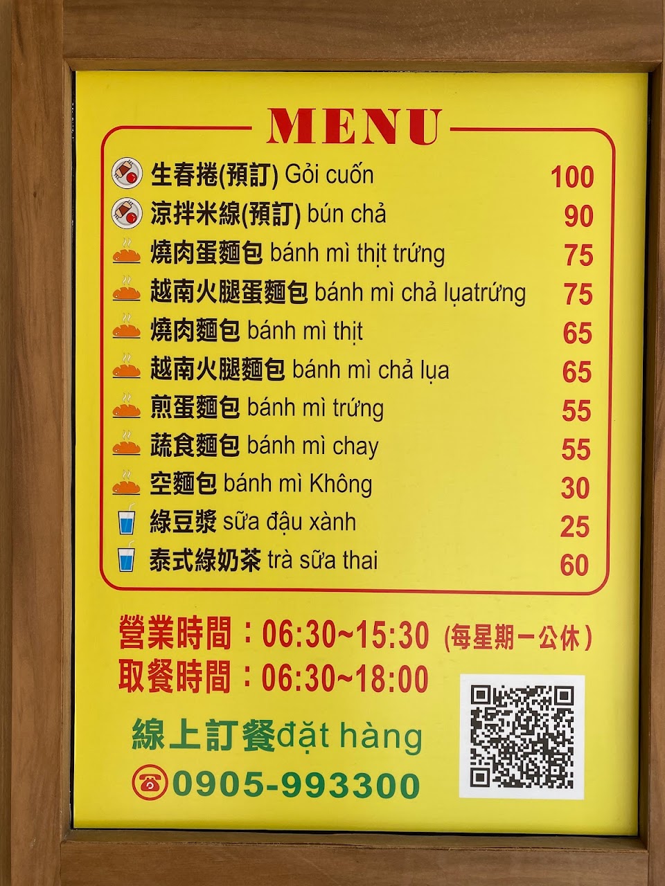 雙拼麵包*** 綠豆漿*** 火腿蛋麵包加蛋* 越式燉牛肉麵包* 服務 外帶 餐點類型 午餐 平均每人消費金額 $1-200