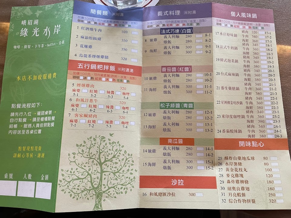 綠光水岸複合式餐廳,室內空間還滿寬敞的!戶外座位旁可以欣賞峨眉湖灣美景!綠光水岸複合式餐廳菜單選項有:排餐、簡餐、義式料理、五行鍋粑拌飯、火鍋、下午茶、各式飲品!韓式泡菜鍋,泡菜味道還蠻厚實的!肉品(豬肉)跟菜盤放一起!菜盤內除了季節蔬菜還有一些火鍋料跟冬粉!(當然也有附一碗白飯跟醬料囉!)加價100元升級套餐,有飲料、水果和甜點!
