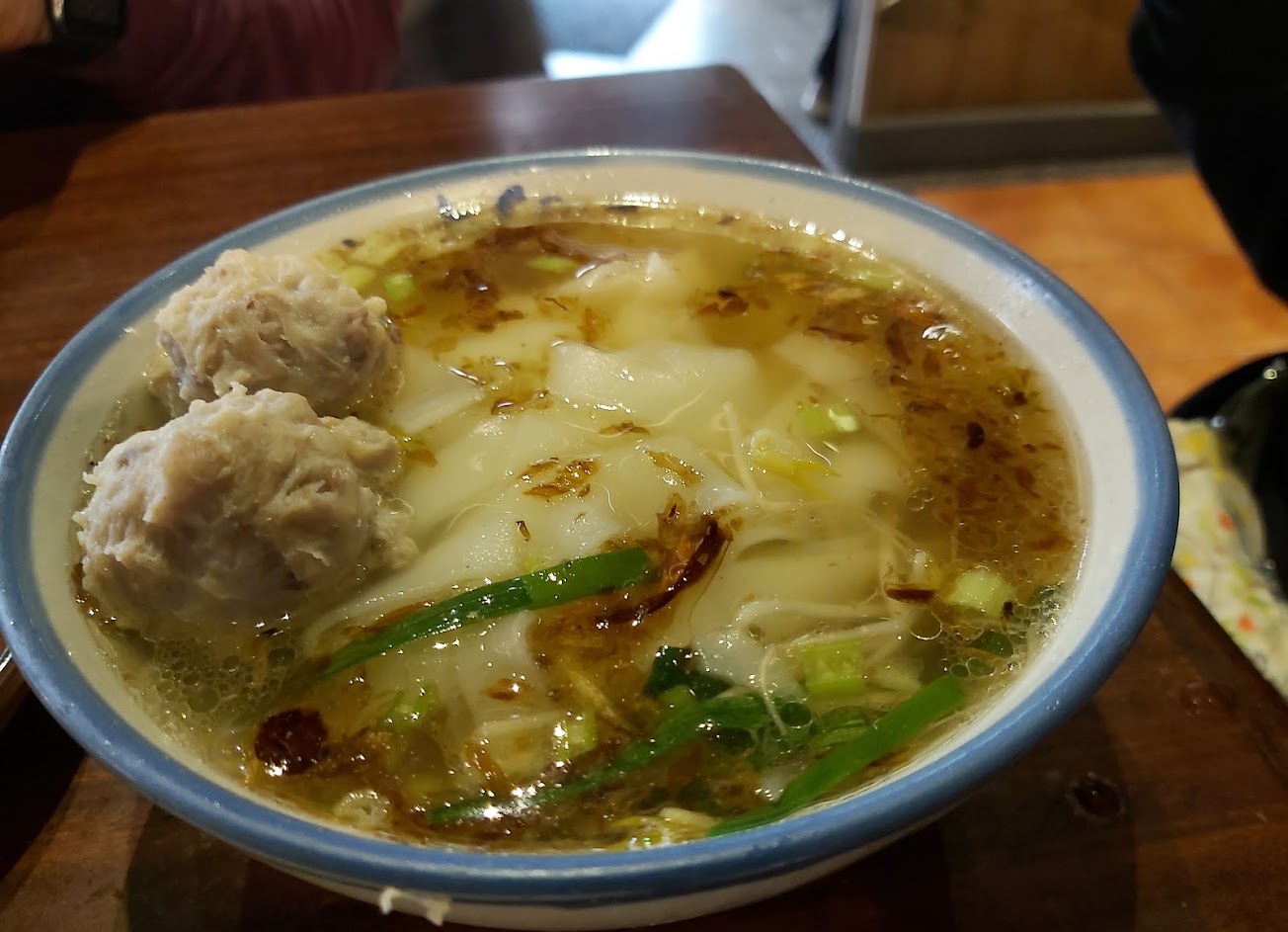 店員會很大聲地喊歡迎光臨後,其他服務同仁也會跟著一起喊,蠻有活力的店。 拿到菜單以後看了兩種主食的套餐 一個是板條另一個是麵 搭配兩樣不同的湯品 丸子三兄弟湯、芋角餛飩湯 湯頭清甜丸子三種口味不錯吃 麵條及板條的油蔥香氣蠻濃郁的 麵是用香Q的扁油麵,加上豆芽菜、韭菜及淋上特製的葱油醬,蠻樸實與爽口的。 但魯肉飯就很普通,肉沒什麼滷透的感覺。