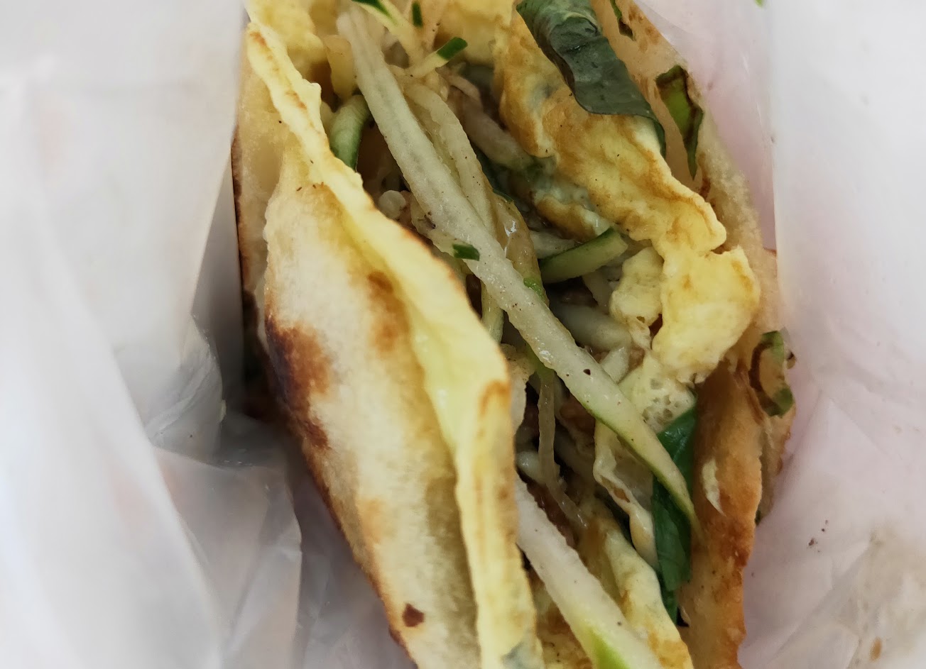 吃了蔥油餅加蛋+牛肉捲餅共50元,蔥油餅普通但是很便宜20元,牛肉捲餅非常有誠意,滿滿的九層塔更不少的牛肉,包裝也非常用心,下次還會再來。