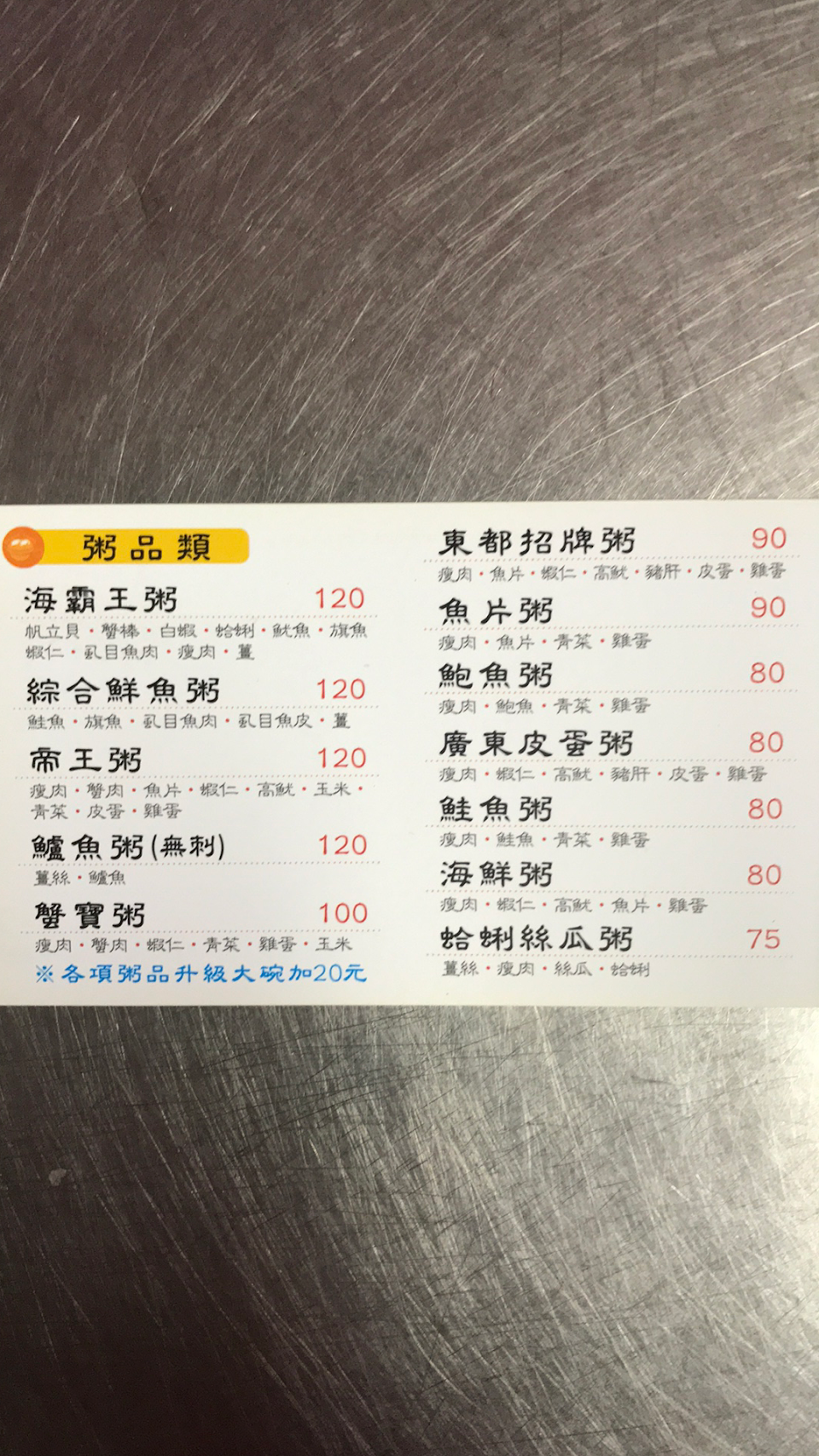 此餐廳販賣粥類。衛生可口價格公道。/