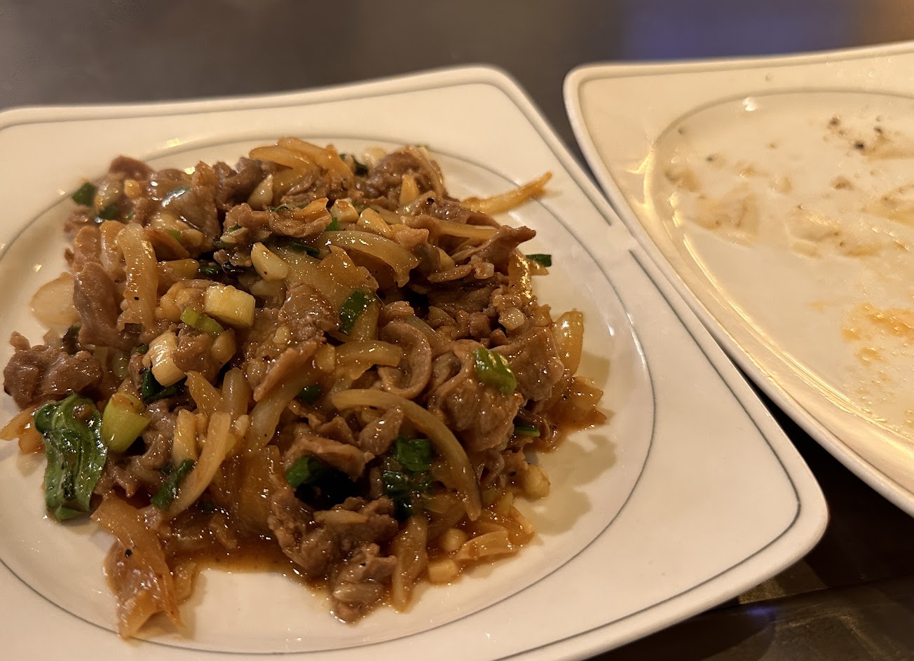 米飯聞起來像放了幾天的味道,但我餓了所以就吃了。我要的是炒豆芽要辣,我就吃了,還挺好吃的。炒雞和烤魚很好吃,炒羊肉還可以,但我覺得會有好惡之分。與其他鐵板燒餐廳相比,它並不便宜。