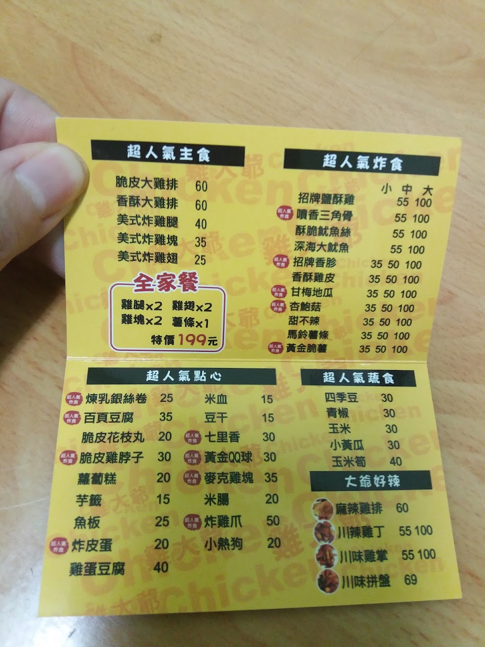 炸雞不錯吃,有胖老爹的水準! 服務 外帶 餐點類型 晚餐 平均每人消費金額 $200-400 餐點:4 服務:4 氣氛:3 停車位 停車位有點難找 附近的停車場 不提供停車位