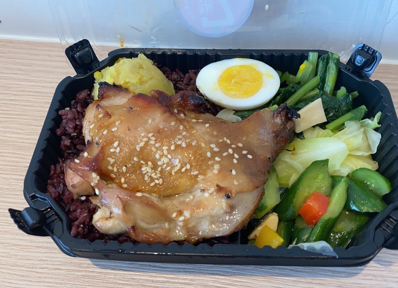 雞肉,鮭魚好吃,紫米份量足,只是今天的菜有炒冬粉和青菜 但還是可以再買