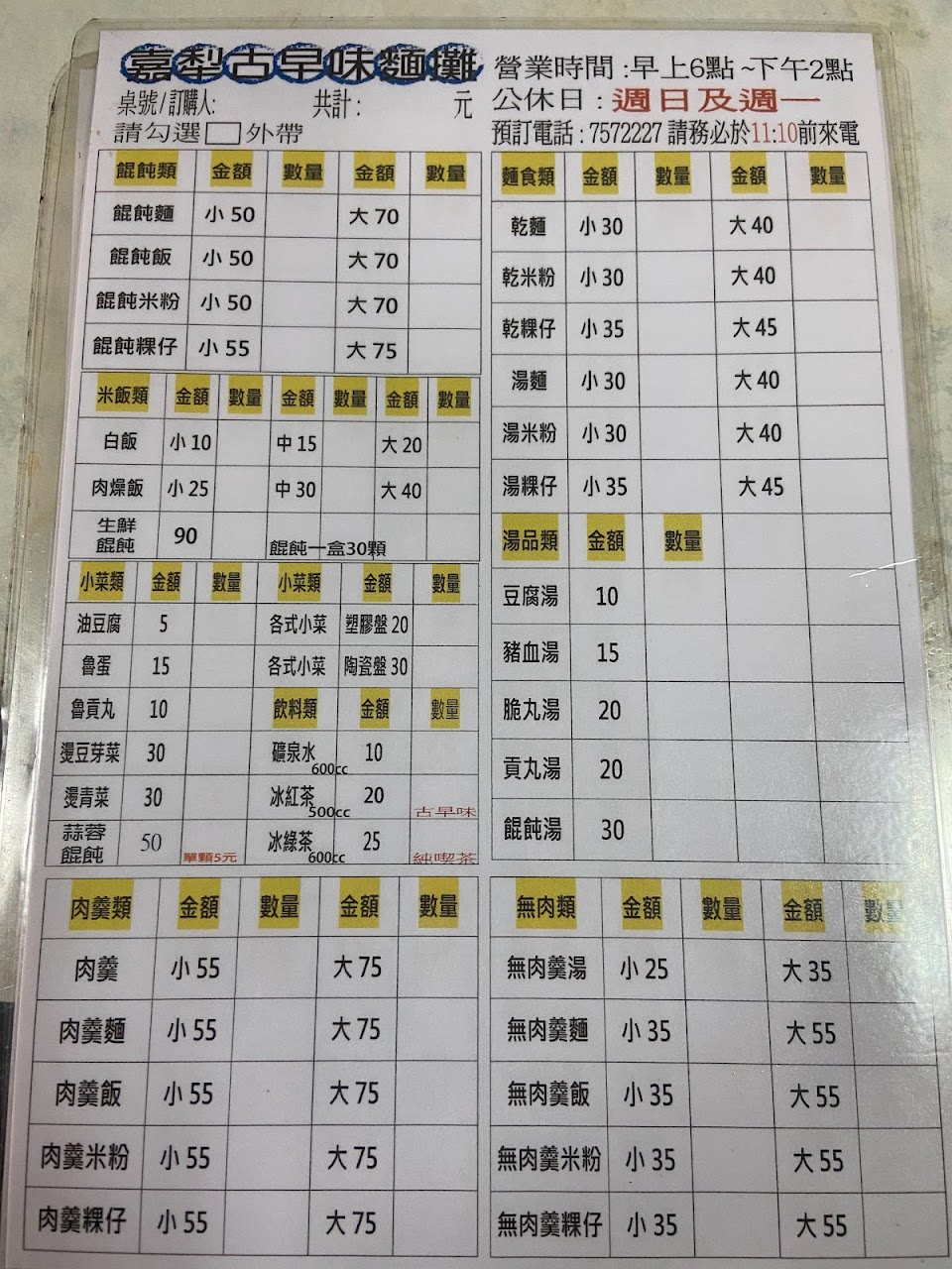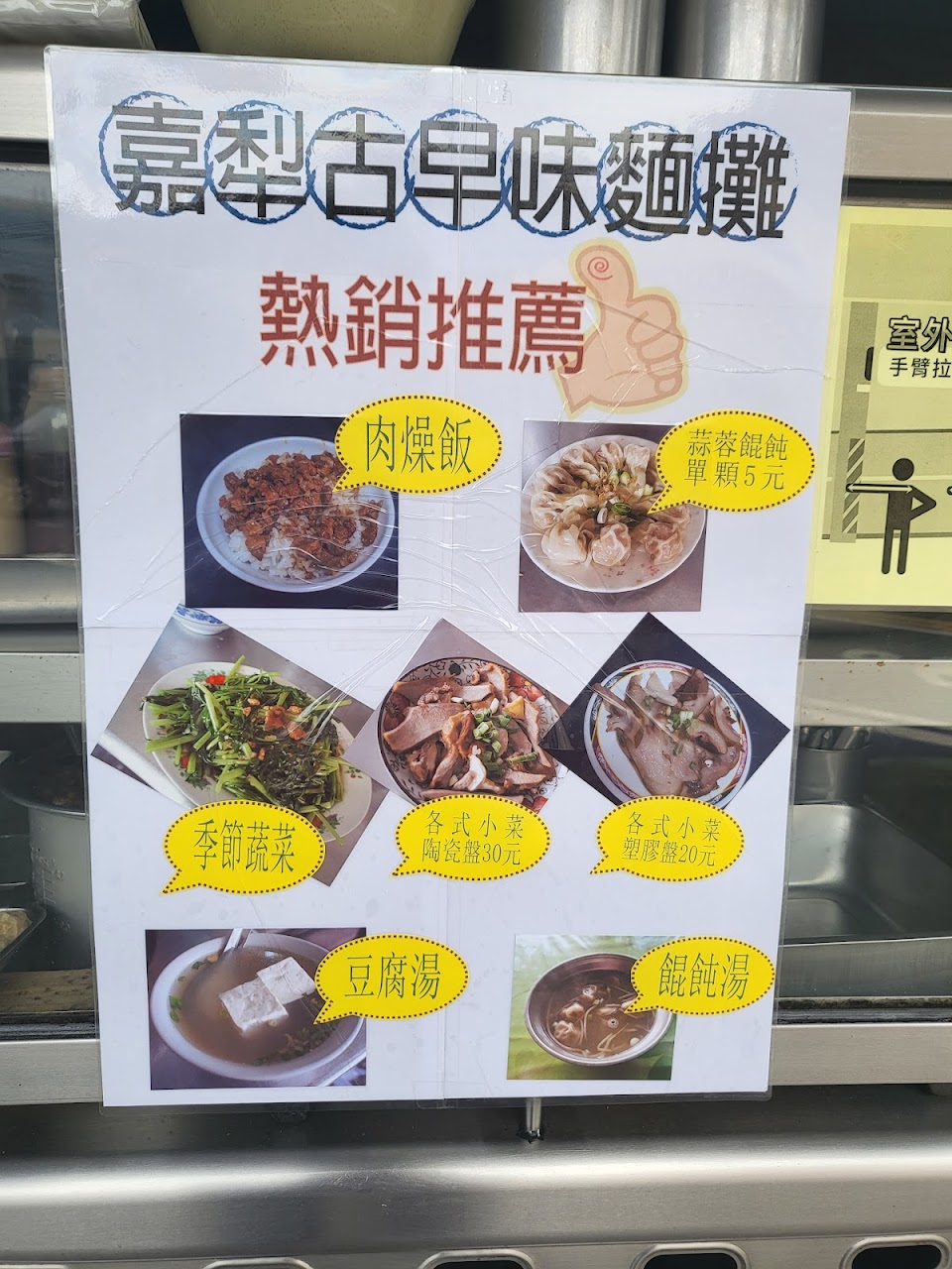 東西非常好吃,而且價格合理,但是衛生方面就比較沒有這麼理想,是適合吃粗飽的傳統麵攤,招牌是肉羹湯.麵.米粉.粿仔條及筒仔米糕如由於是傳統的路邊攤店家店家,排隊及內用有時人多會比較亂,內用不必排隊直接填單,交給任意工作人員即可!外面並無招牌看板,外地來的人若找不到可以搜尋嘉梨派出所或問附近的人,他賣早午餐,還有每週一會公休,盡量避開用餐熱門時段,總結:吃粗飽價位又合理口味又大眾化,雖然沒有在餐廳的環境以及氣氛,,